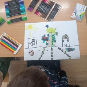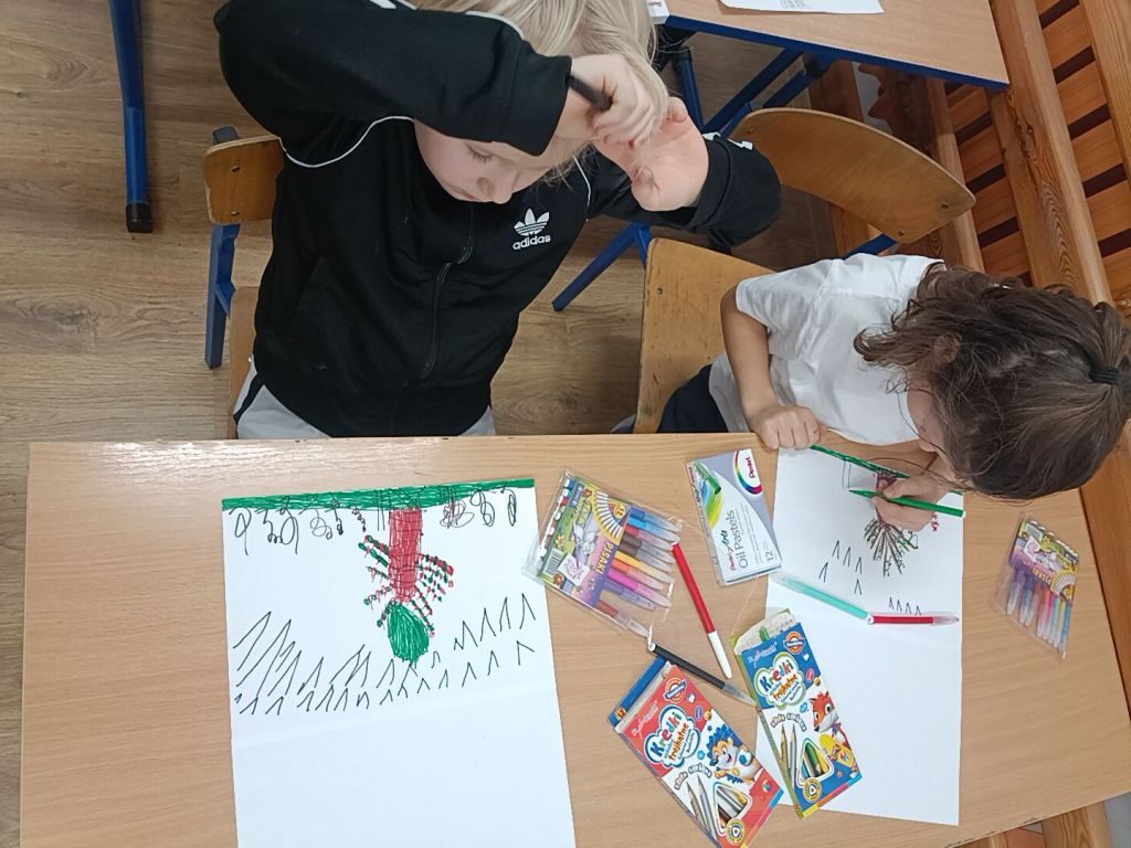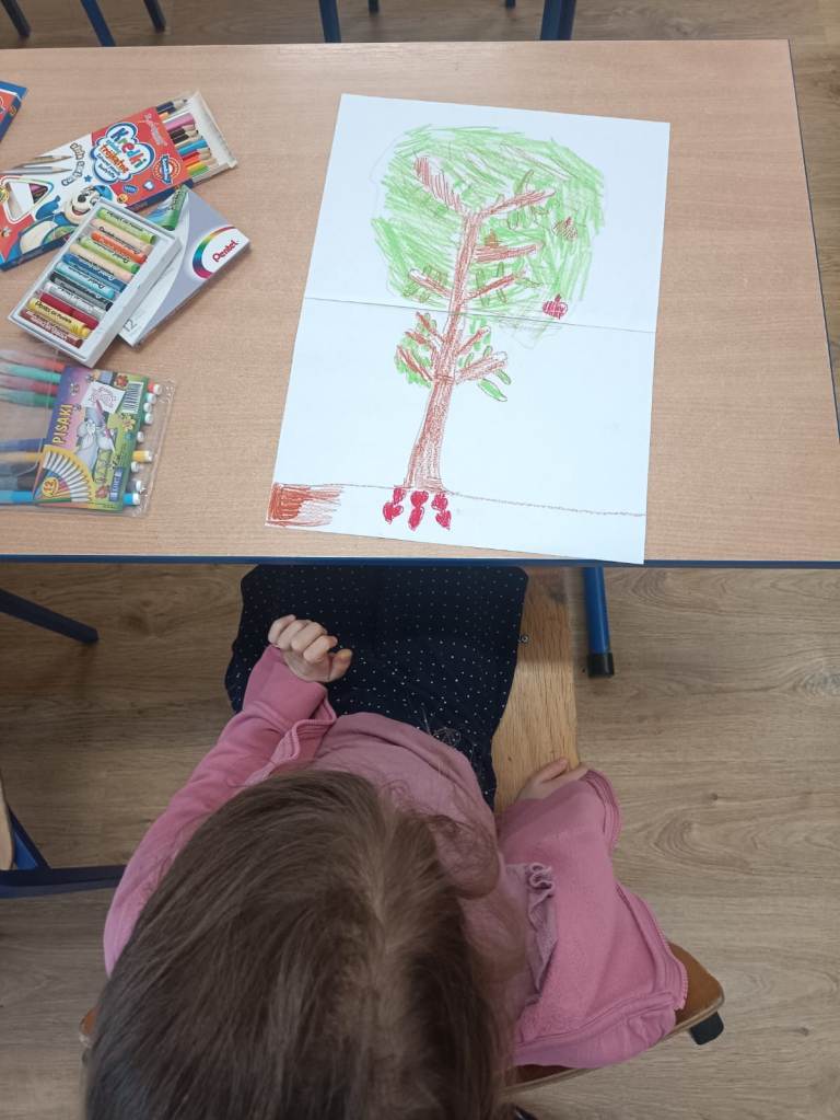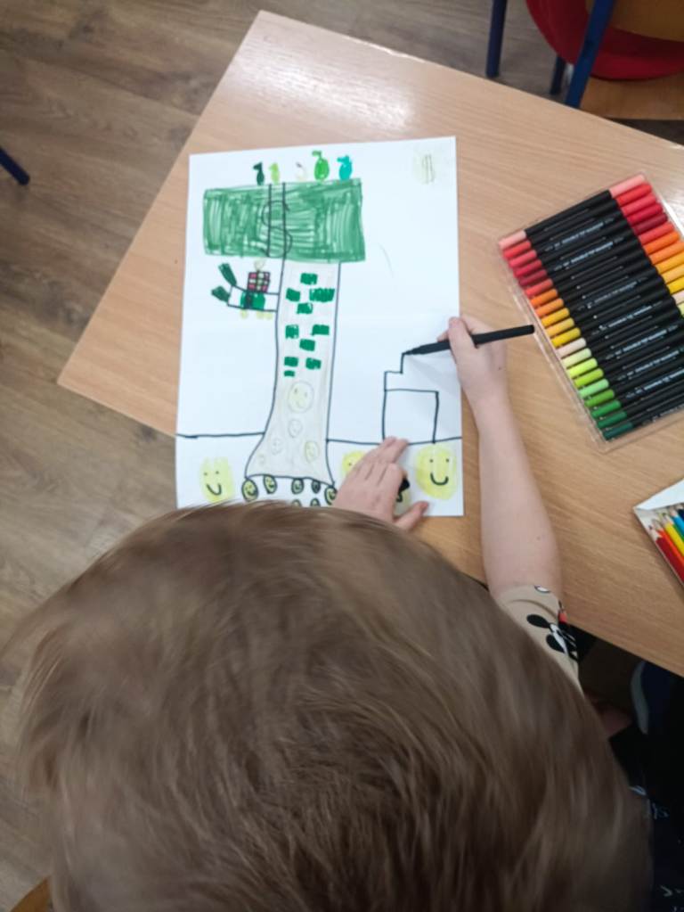Podczas zajęć dzieci rysowały swoje drzewa, w których każda część symbolizowała inny aspekt ich życia: