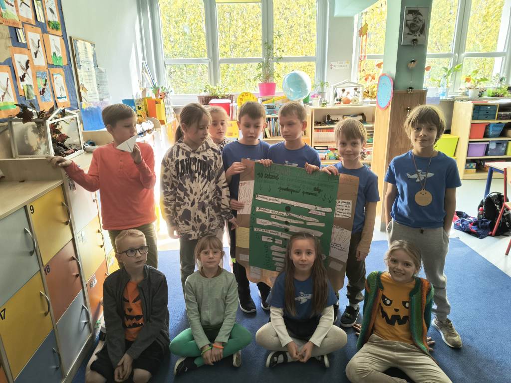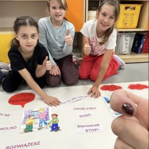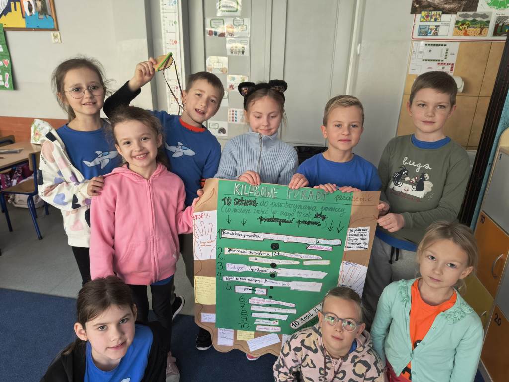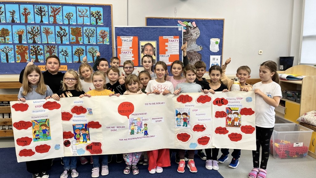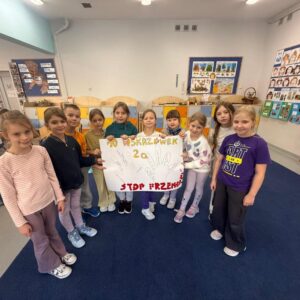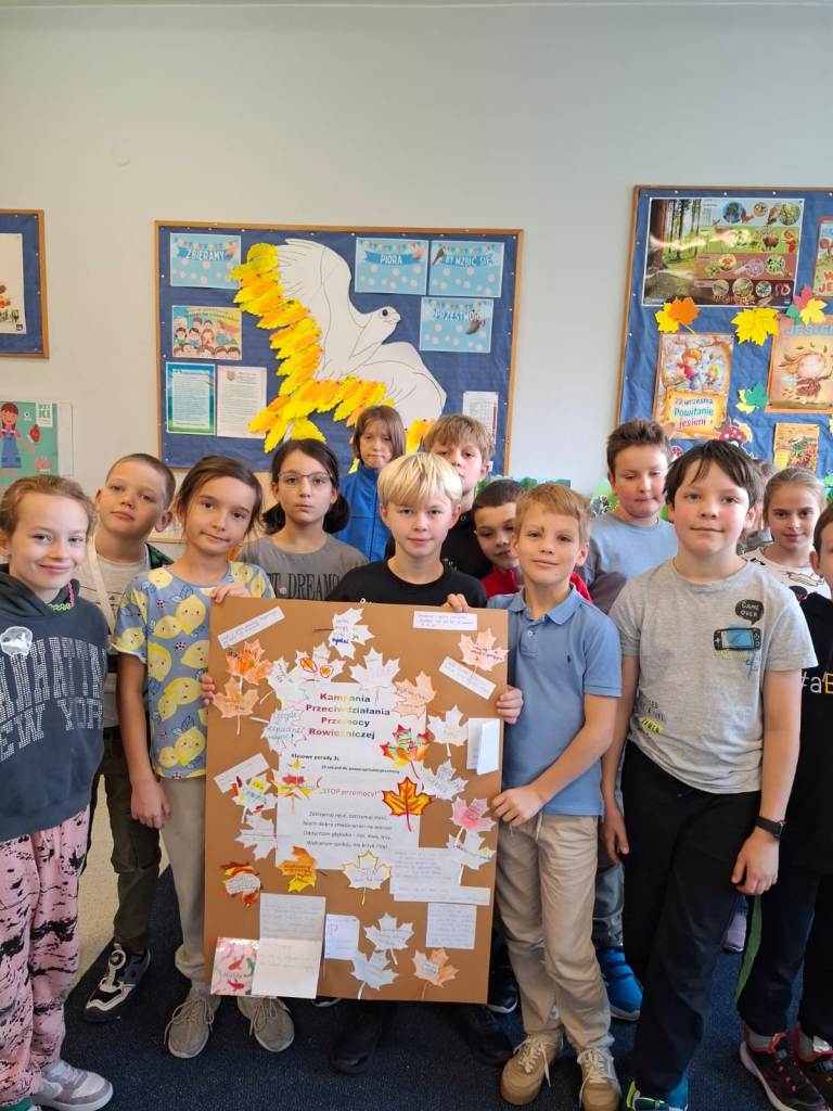 W październiku uczniowie klas 2-3 brali udział w apelach i zajęciach, których celem była nauka zachowań mających przeciwdziałać przemocy rówieśniczej oraz propagować pozytywne relacje. W ramach Małej Ligi Klas dzieci wraz z nauczycielami przygotowały plakaty ukazujące, co możemy zrobić, by w ciągu 10 sekund powstrzymać przemoc. Do zadania zostali włączeni także Rodzice – bardzo dziękujemy za wsparcie i zaangażowanie. Efekty i porady uczniów można podziwiać w holu szkoły. Na zakończenie miesiąca w każdej z klas zostali wybrani medaliści w kategoriach: Superbohaterów Trudnych Sytuacji, Ambasadorów Dobrej Atmosfery oraz Superwytrwałych Bohaterów. Wszystkim nagrodzonym gratulujemy.