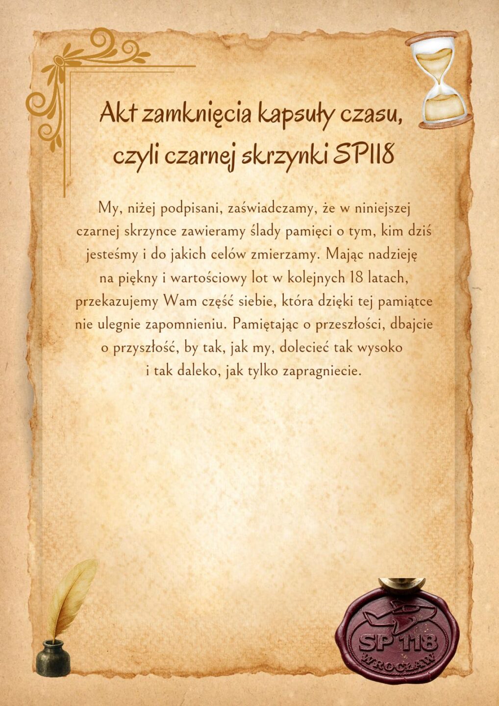 Wszystkie listy zostały umieszczone w specjalnej kapsule czasu, która została uroczyście zamknięta 13 marca 2026 roku. Jej zawartość zostanie otwarta podczas 50-lecia szkoły, aby przyszłe pokolenia mogły zobaczyć, jak wyglądało życie uczniów SP 118 w 2026 roku.