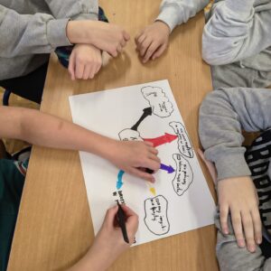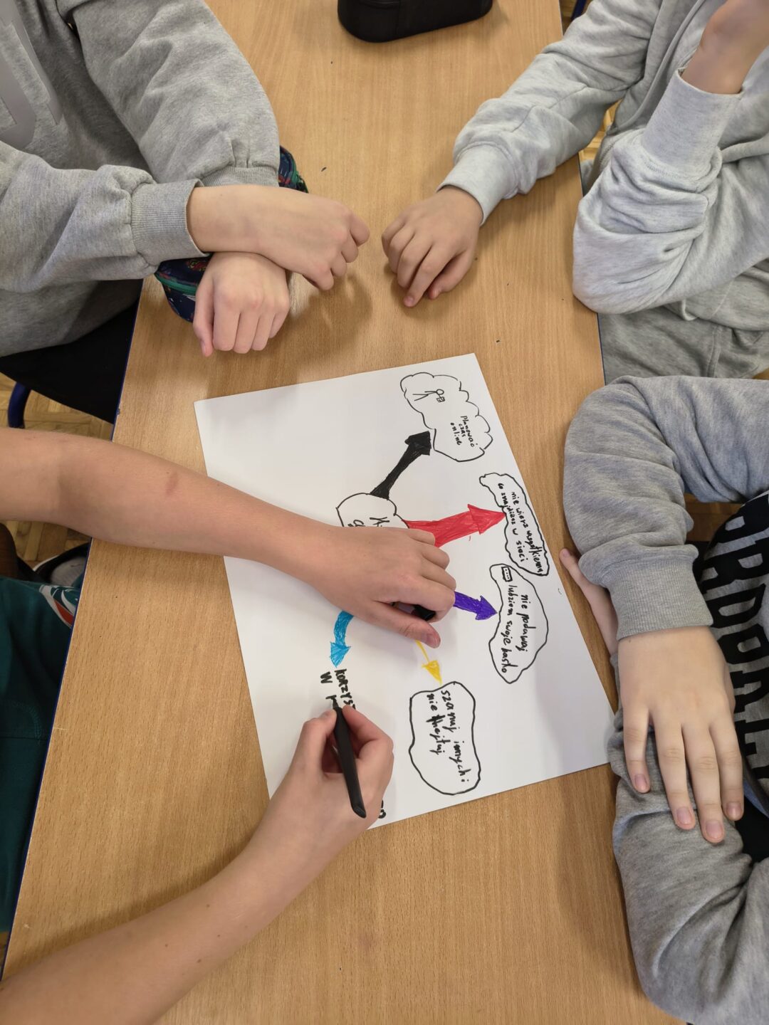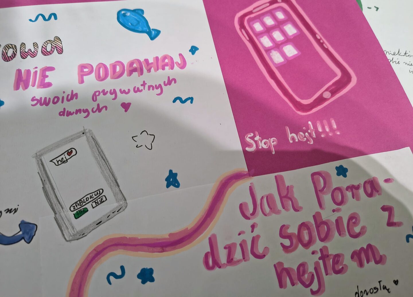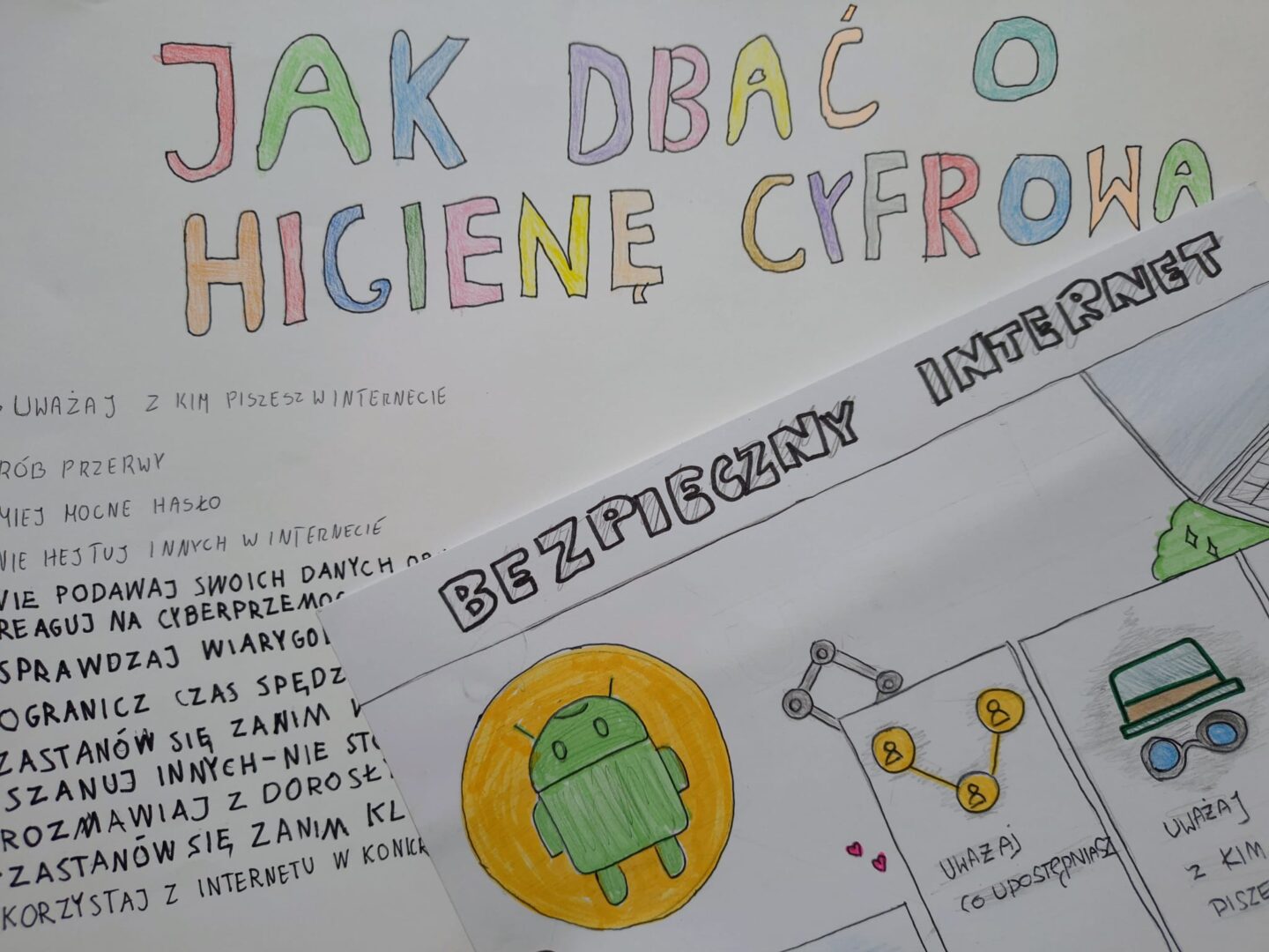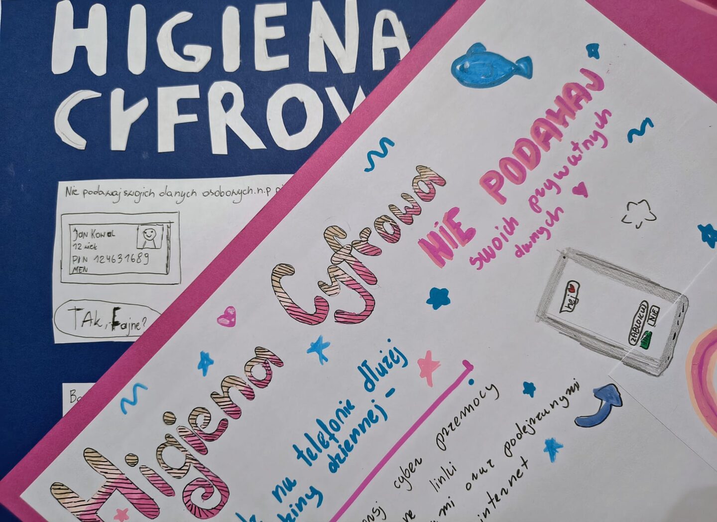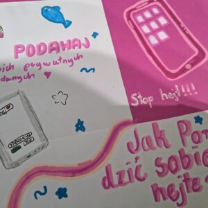 W ramach pracy projektowej uczniowie wykazali się dużą kreatywnością, wspólnie przygotowując plakaty, które w ciekawy sposób przedstawiały zasady bezpiecznych zachowań w sieci m.in.: ochronę prywatności, kulturę komunikacji online, umiar w korzystaniu z ekranów oraz reagowanie na zagrożenia. To była cenna lekcja świadomego bycia w świecie cyfrowym.