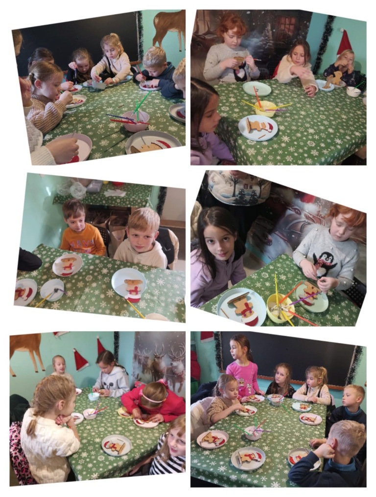Nie mogło zabraknąć także piernikowego lukrowania. Choć receptura Pani Mikołajowej pozostaje tajemnicą, pierwszoklasiści z zapałem dekorowali pachnące pierniczki, tworząc słodkie, kolorowe dzieła.