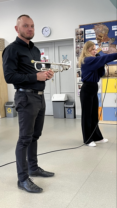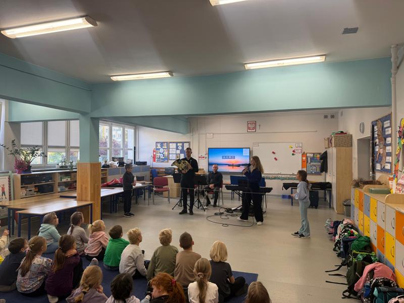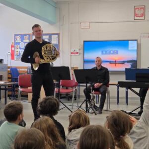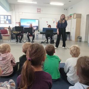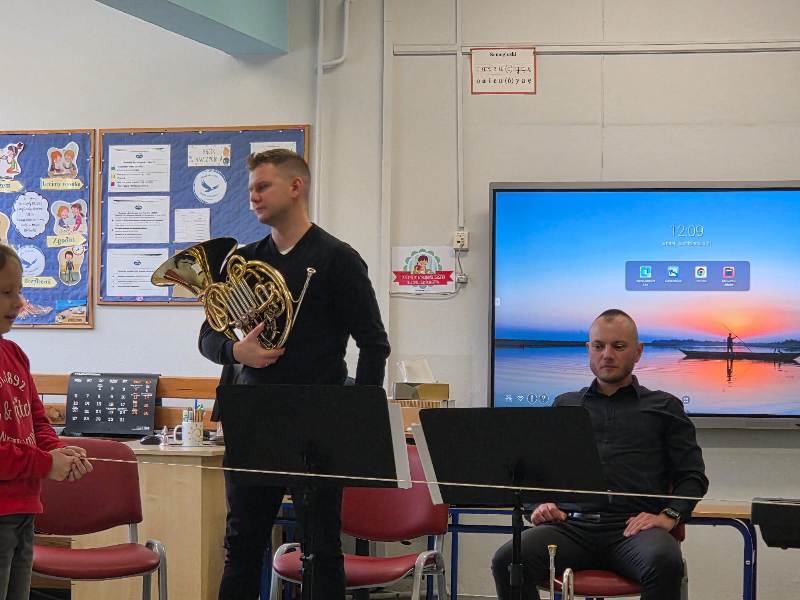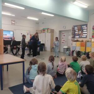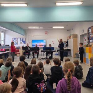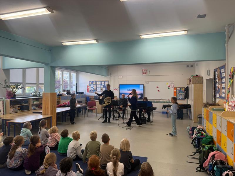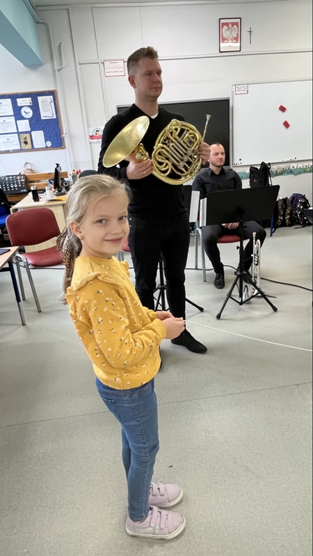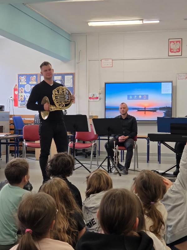 We wtorek pierwsza grupa uczniów z klas 1-3 uczestniczyła w spotkaniu z cyklu „Wyjazdowe audycje muzyczne”. Uczniowie mieli okazję wybrać się w niezwykłą podróż z muzykami Narodowego Forum Muzyki. Spotkanie było poświęcone instrumentom dętym blaszanym – takim jak trąbka i waltornia, którym dało też wsparcie pianino elektryczne. Uczniowie poznali historię, budowę oraz brzmienie tych instrumentów. Wysłuchaliśmy kilku utworów, ale Muzyczny galimatias Mozarta oraz hymn naszego ukochanego miasta rozbudził naszą wrażliwość muzyczną!