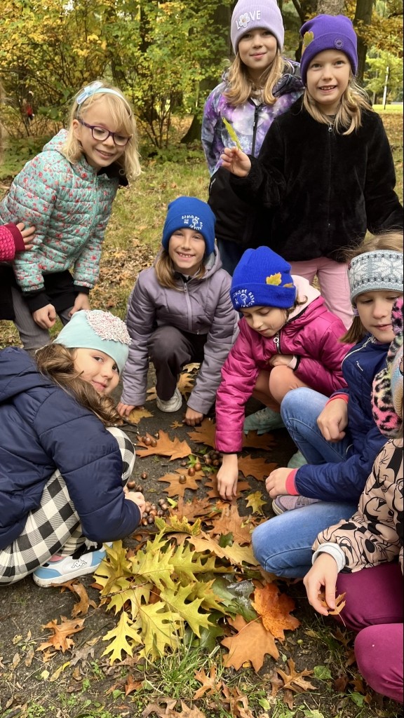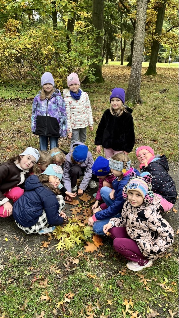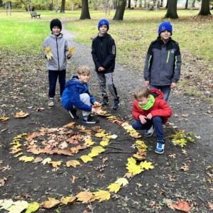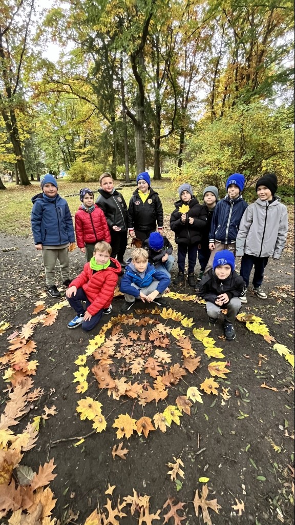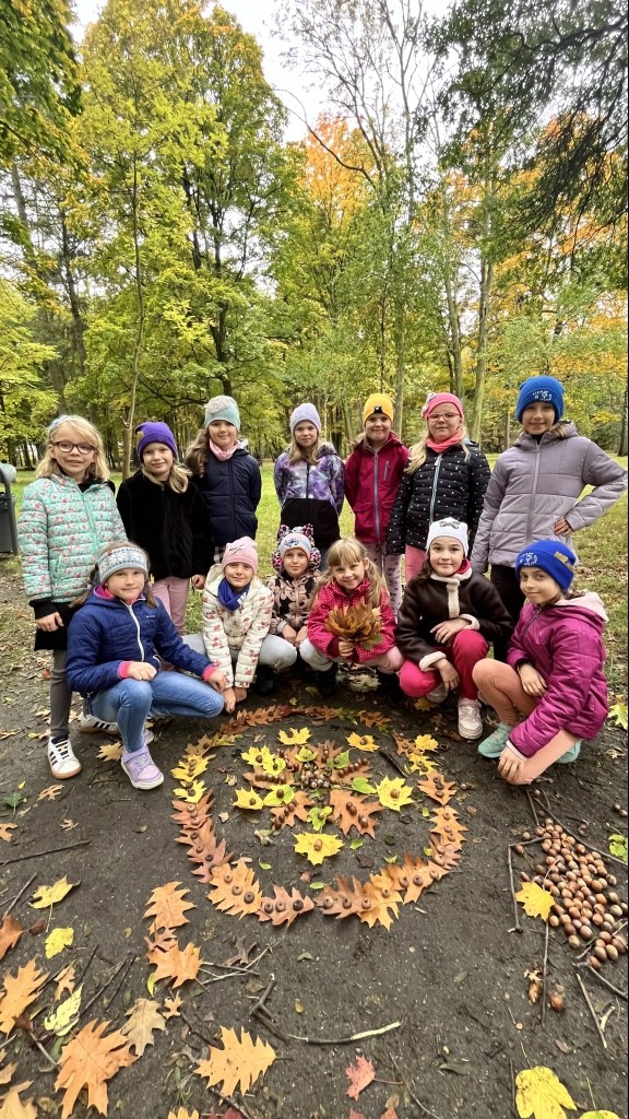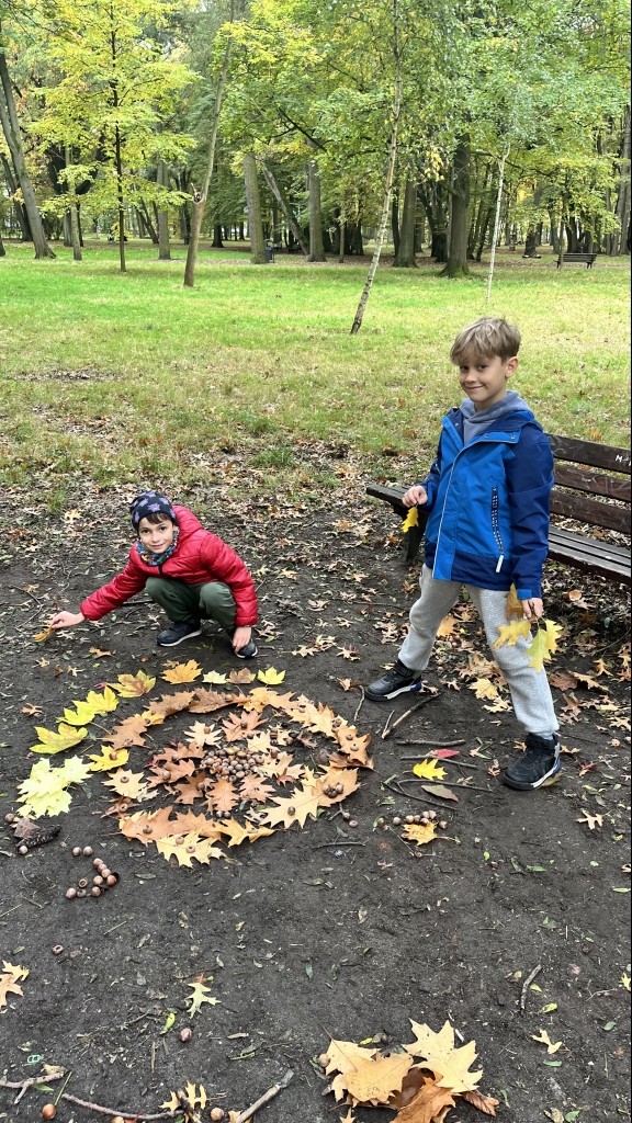 Przy tej okazji poznawaliśmy nazwy drzew, z których pochodzą zebrane okazy. Jesienna pogoda sprawiła, że nasz zmysł wzroku miał dużo pracy – podziwialiśmy cudowne barwy liści, często posiadające kilka kolorów. Oczywiście zauważyliśmy również wiewiórki, które zademonstrowały nam swoje uroki. Ich pędzelkowe uszka i wspaniała ruda kita były podziwiane przez wszystkich. Przy okazji zrozumieliśmy, że aby podziwiać tego małego gryzonia musimy spacerować w ciszy – to też było wspaniałe odczucie. Na zakończenie spaceru uczniowie utrwalali nazwy zebranych darów podczas tworzenia MANDALI PRZYRODNICZYCH i tu zaliczyliśmy 4 zadanie z PROJEKTU KLASA W TERENIE. Podczas pracy rozwijaliśmy również klasowe umiejętności społeczne – współpraca, komunikacja i wsparcie.