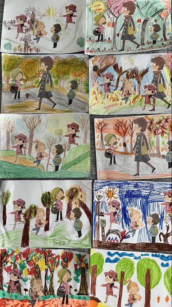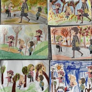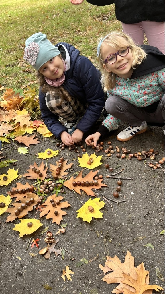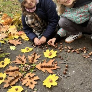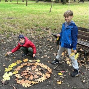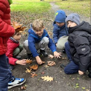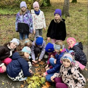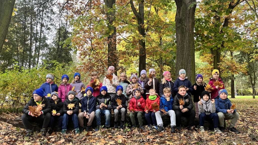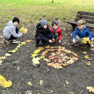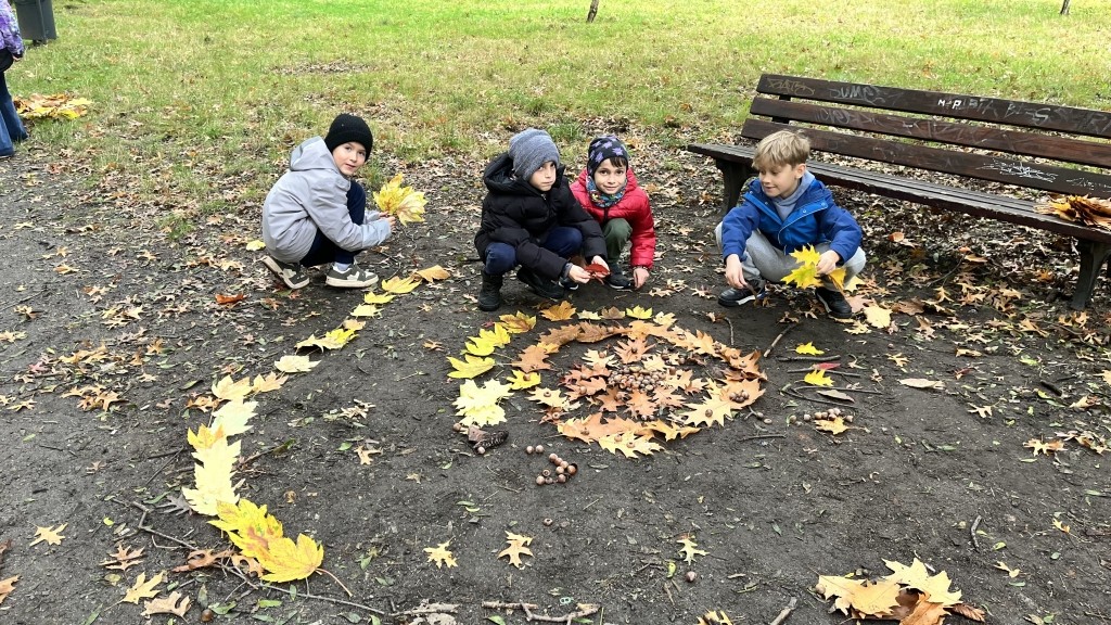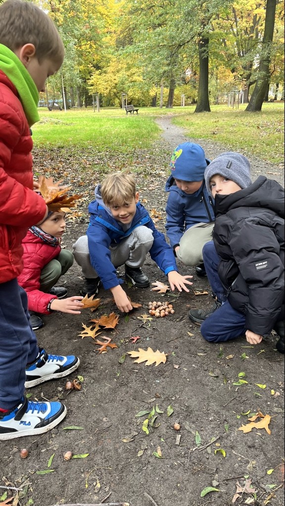 Przy tej okazji poznawaliśmy nazwy drzew, z których pochodzą zebrane okazy. Jesienna pogoda sprawiła, że nasz zmysł wzroku miał dużo pracy – podziwialiśmy cudowne barwy liści, często posiadające kilka kolorów. Oczywiście zauważyliśmy również wiewiórki, które zademonstrowały nam swoje uroki. Ich pędzelkowe uszka i wspaniała ruda kita były podziwiane przez wszystkich. Przy okazji zrozumieliśmy, że aby podziwiać tego małego gryzonia musimy spacerować w ciszy – to też było wspaniałe odczucie. Na zakończenie spaceru uczniowie utrwalali nazwy zebranych darów podczas tworzenia MANDALI PRZYRODNICZYCH i tu zaliczyliśmy 4 zadanie z PROJEKTU KLASA W TERENIE. Podczas pracy rozwijaliśmy również klasowe umiejętności społeczne – współpraca, komunikacja i wsparcie.
