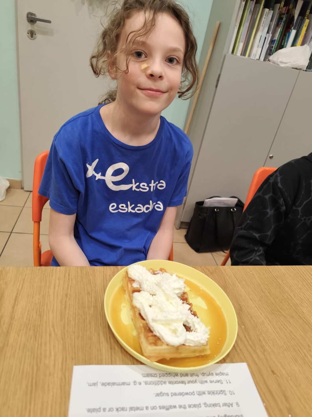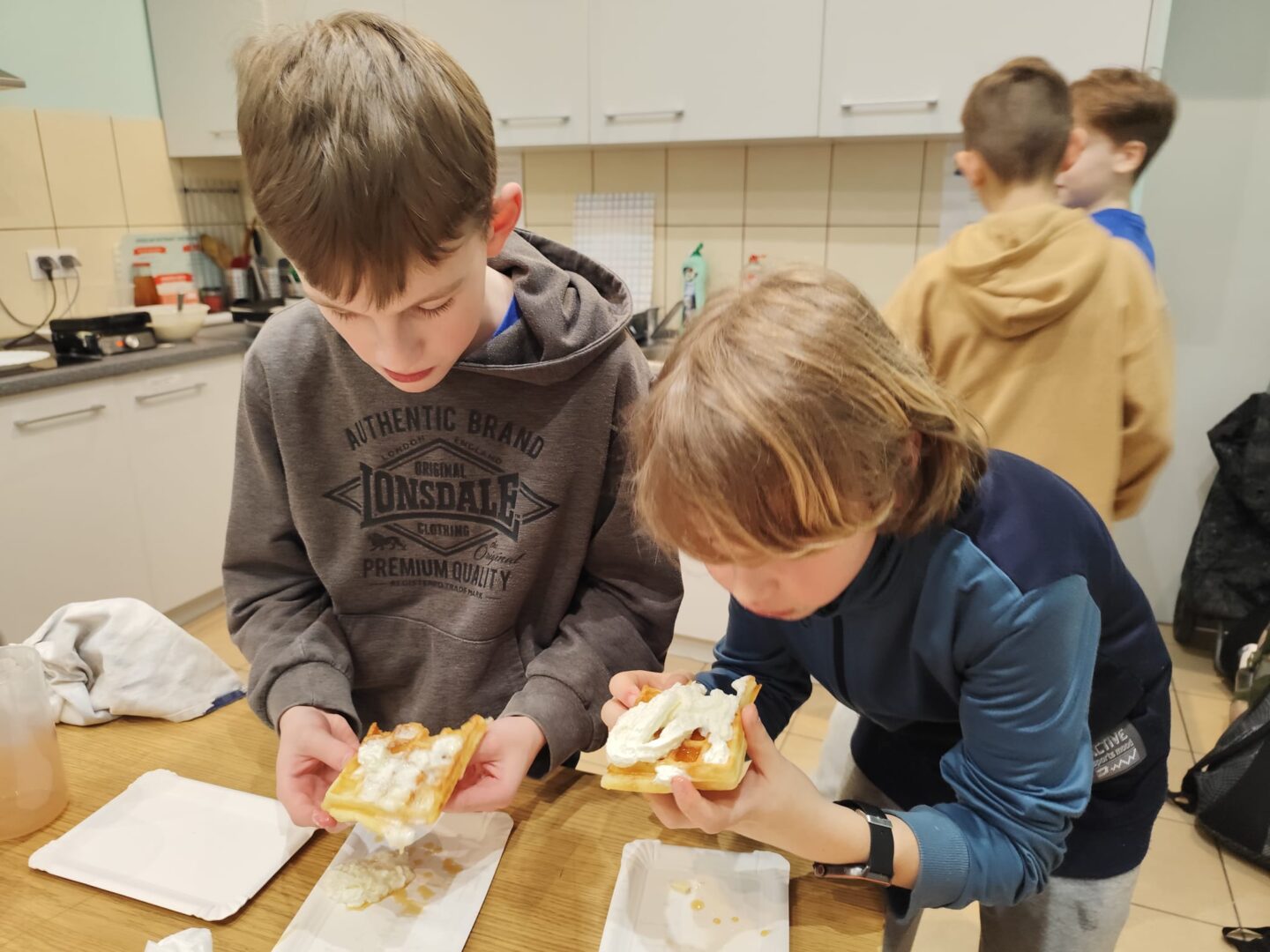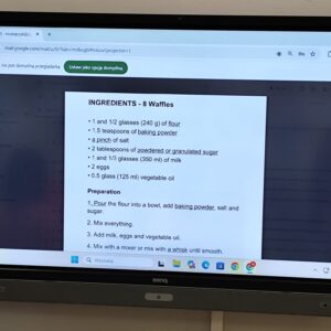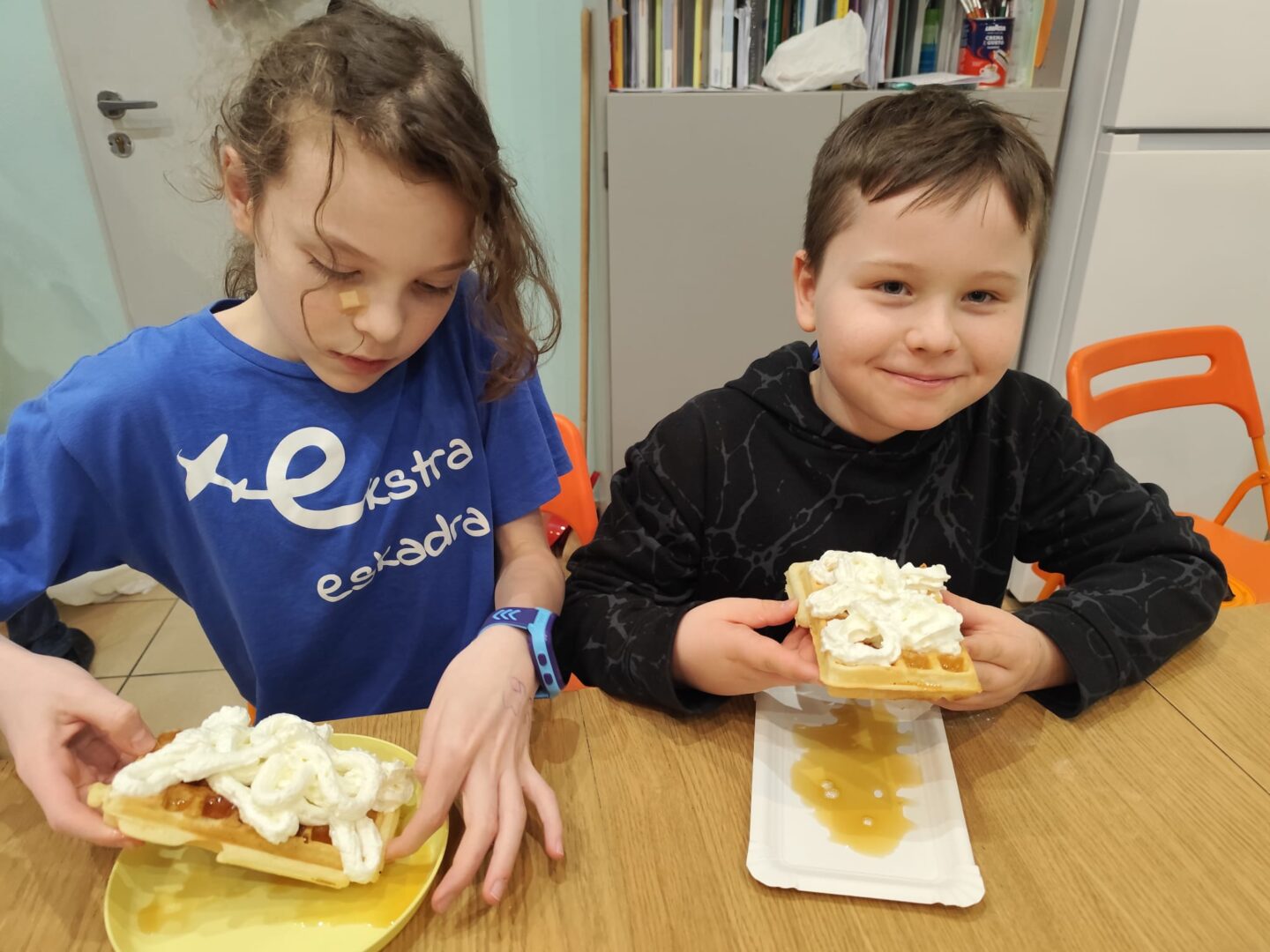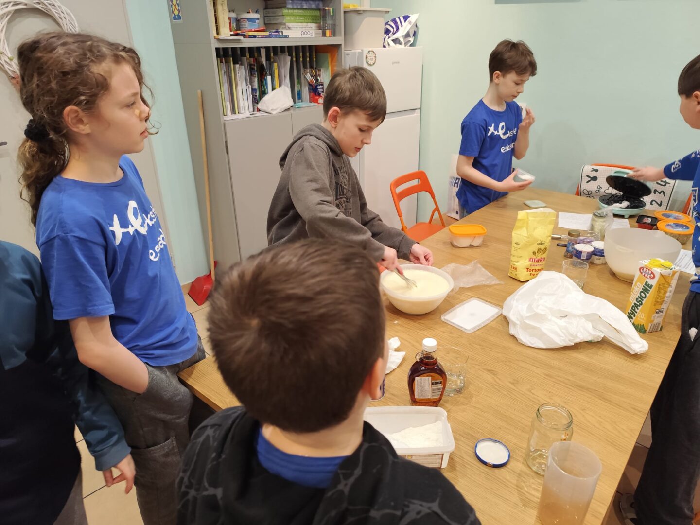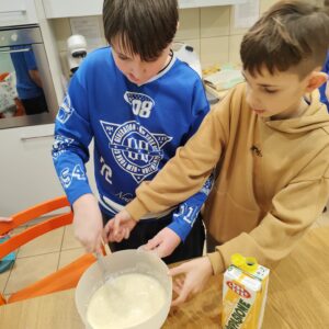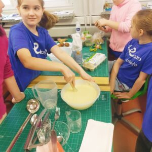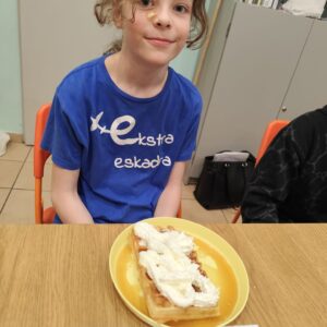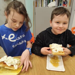 Uczniowie klasy czwartej w ramach programu nauczania j. angielskiego poznają m.in. nazwy produktów spożywczych. Wprowadzane jest również słownictwo związane ze sprzętami kuchennymi gotowaniem oraz przepisy kulinarne na proste dania. W ramach zajęć poznawaliśmy m.in. przepis na gofry, który to uczniowie klasy 4e postanowili wypróbować w praktyce. Podzieliliśmy się na grupy i korzystając z tego, iż w naszej szkole jest specjalna sala do gotowania wyposażona w sprzęt kuchenny, dzieci ochoczo przystąpiły do działania i przygotowały ”waffles” wg przepisu w j. angielskim. Nie zabrakło dodatków takich jak maple syrup, strawberries, bluberries, whipped cream and sprinkles. Sądząc po minach jedzących (fotorelacja poniżej) oraz tempie w jakim gofry znikały z talerzy, można uznać, co zresztą przyznali sami uczniowie, że była to: ”the most delicious English lesson”.
