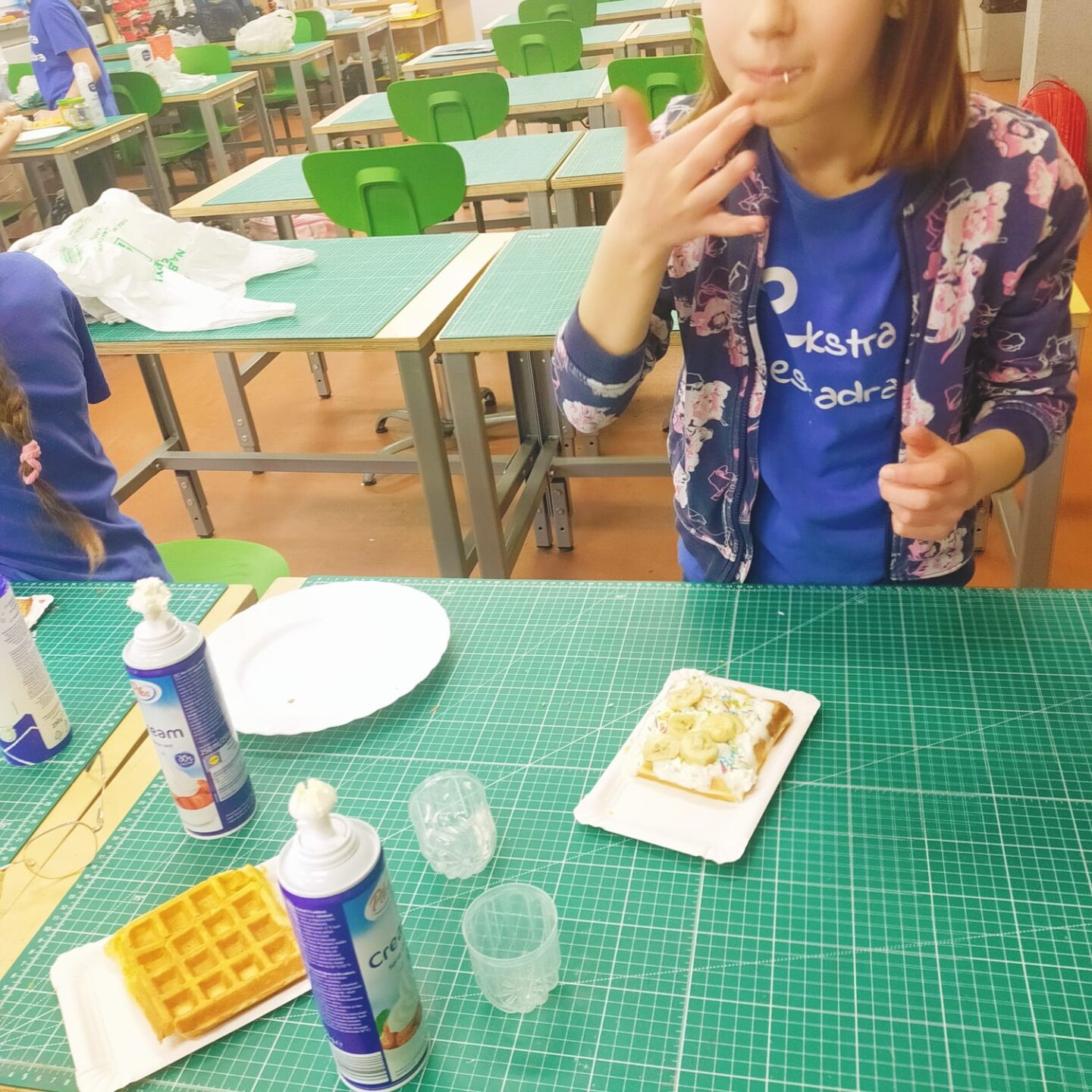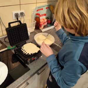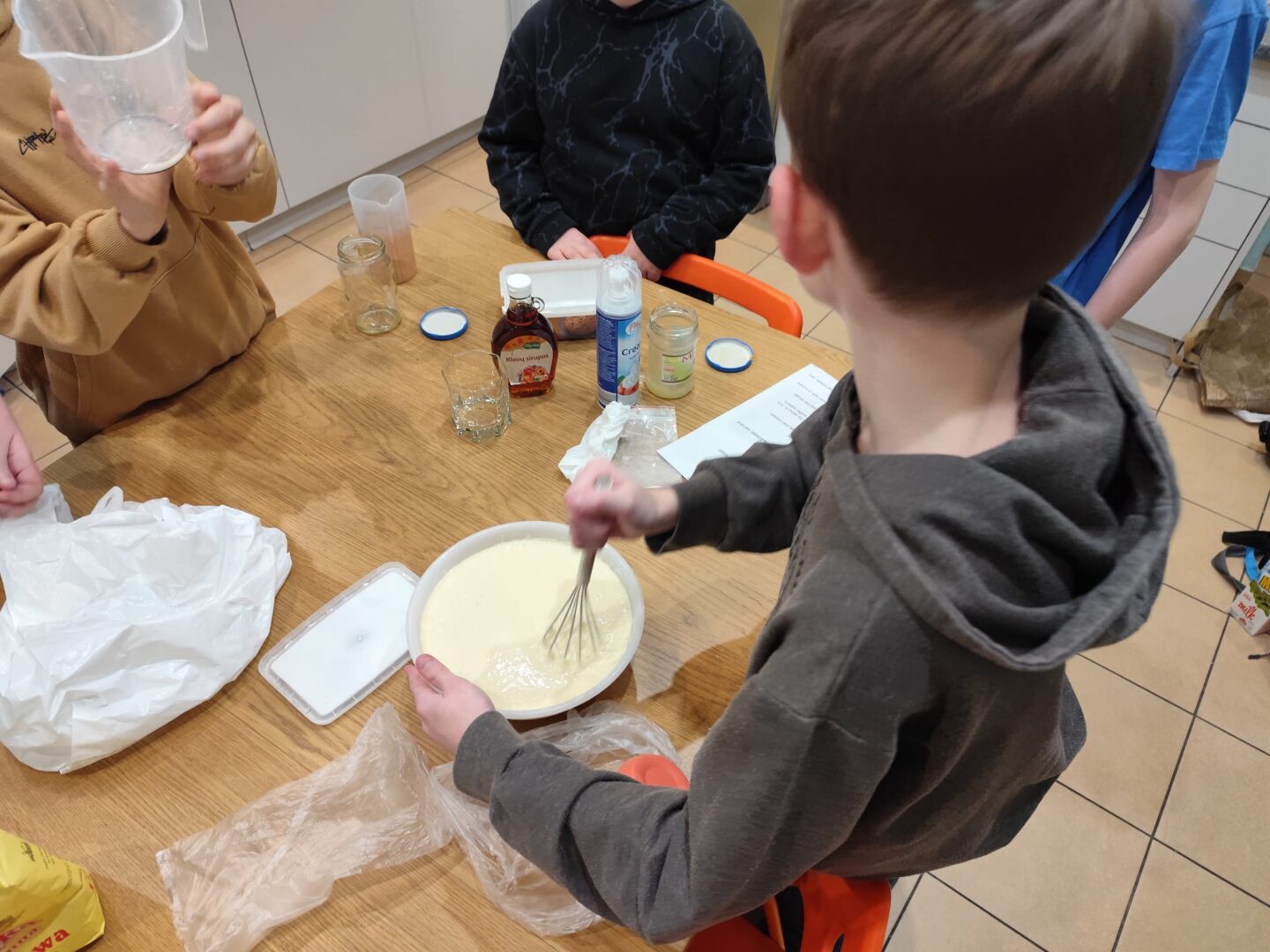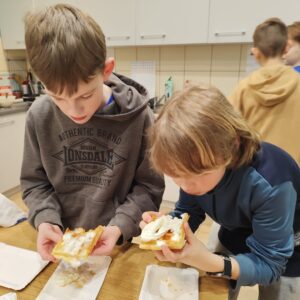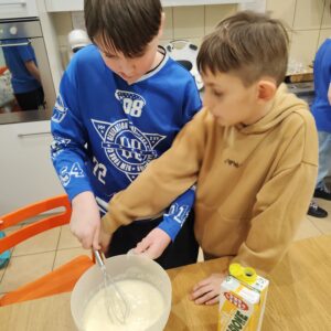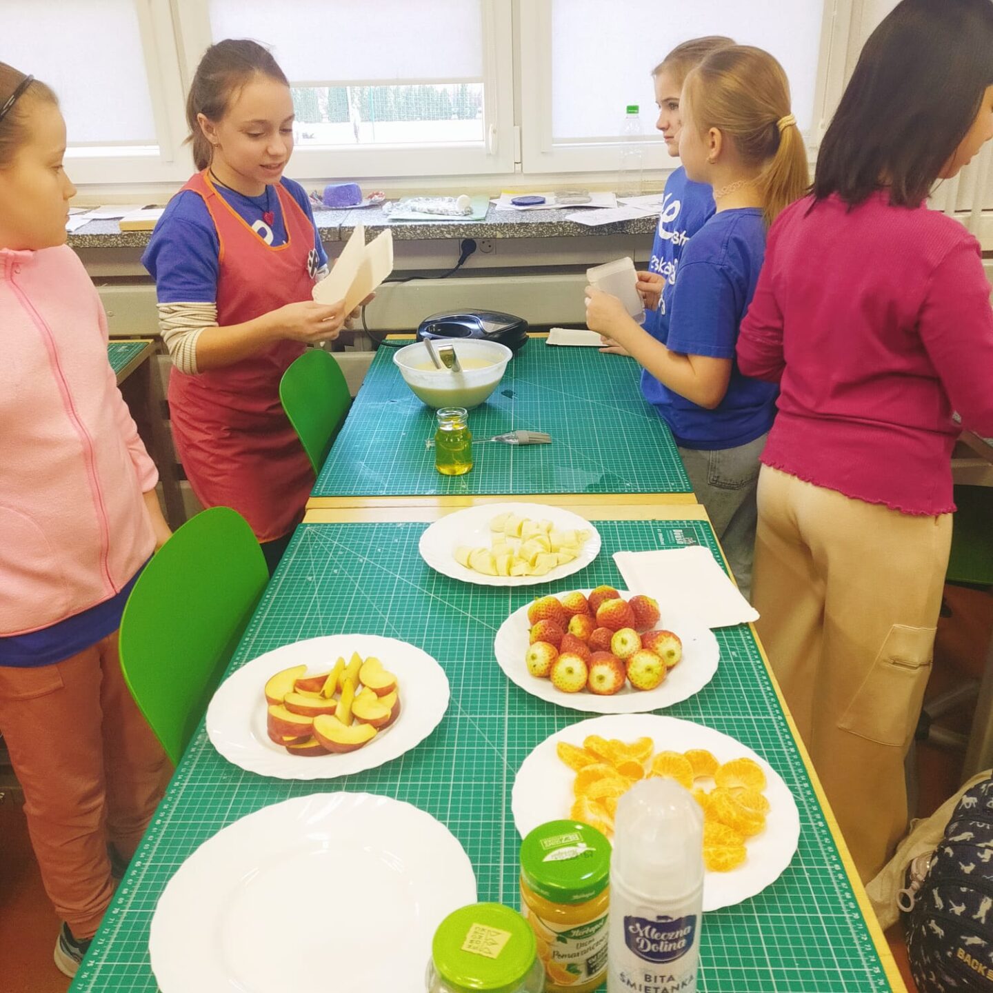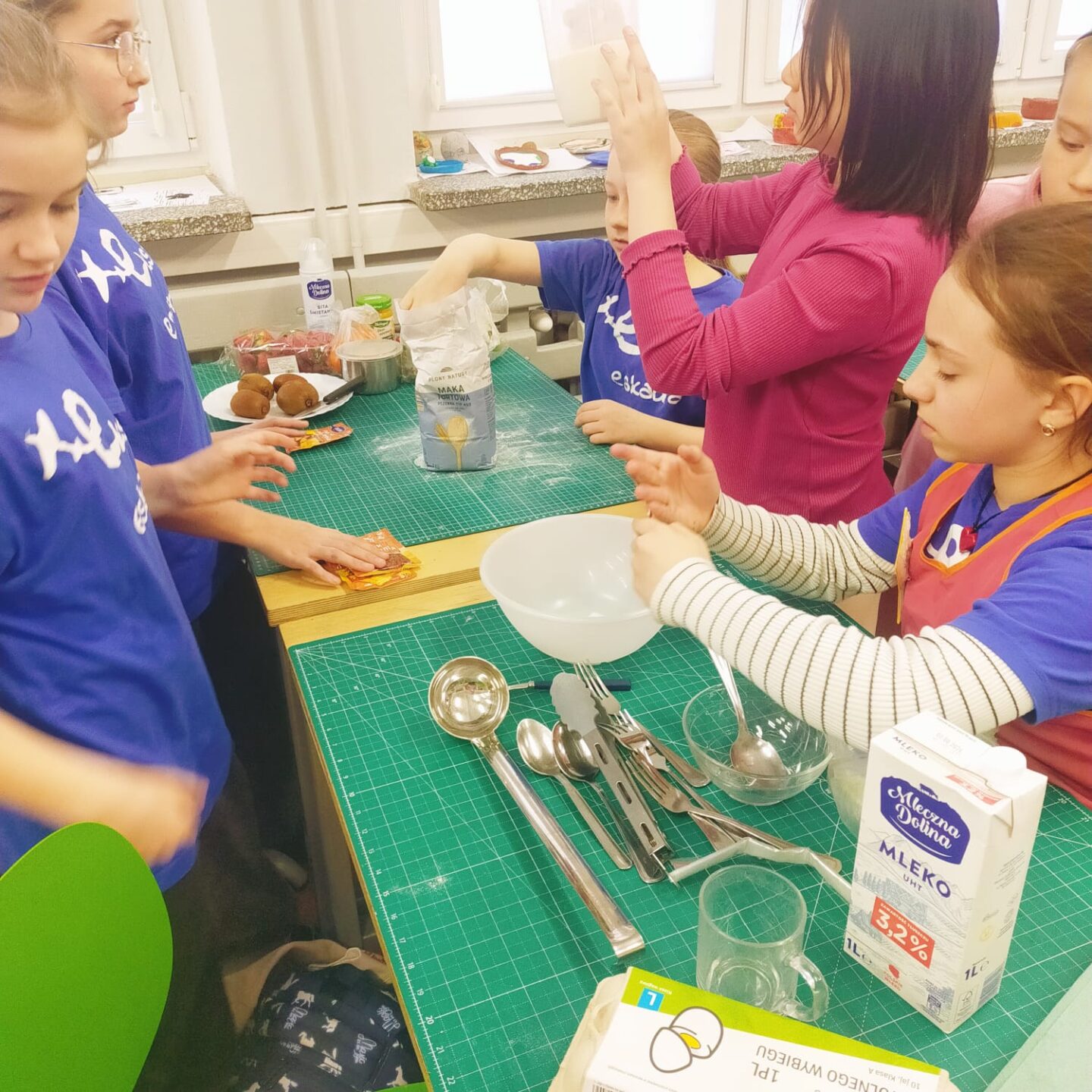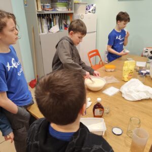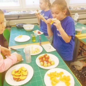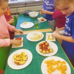 Uczniowie klasy czwartej w ramach programu nauczania j. angielskiego poznają m.in. nazwy produktów spożywczych. Wprowadzane jest również słownictwo związane ze sprzętami kuchennymi gotowaniem oraz przepisy kulinarne na proste dania. W ramach zajęć poznawaliśmy m.in. przepis na gofry, który to uczniowie klasy 4e postanowili wypróbować w praktyce. Podzieliliśmy się na grupy i korzystając z tego, iż w naszej szkole jest specjalna sala do gotowania wyposażona w sprzęt kuchenny, dzieci ochoczo przystąpiły do działania i przygotowały ”waffles” wg przepisu w j. angielskim. Nie zabrakło dodatków takich jak maple syrup, strawberries, bluberries, whipped cream and sprinkles. Sądząc po minach jedzących (fotorelacja poniżej) oraz tempie w jakim gofry znikały z talerzy, można uznać, co zresztą przyznali sami uczniowie, że była to: ”the most delicious English lesson”.