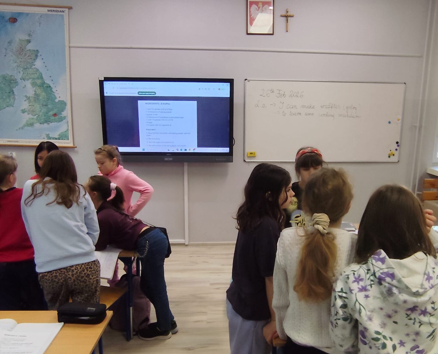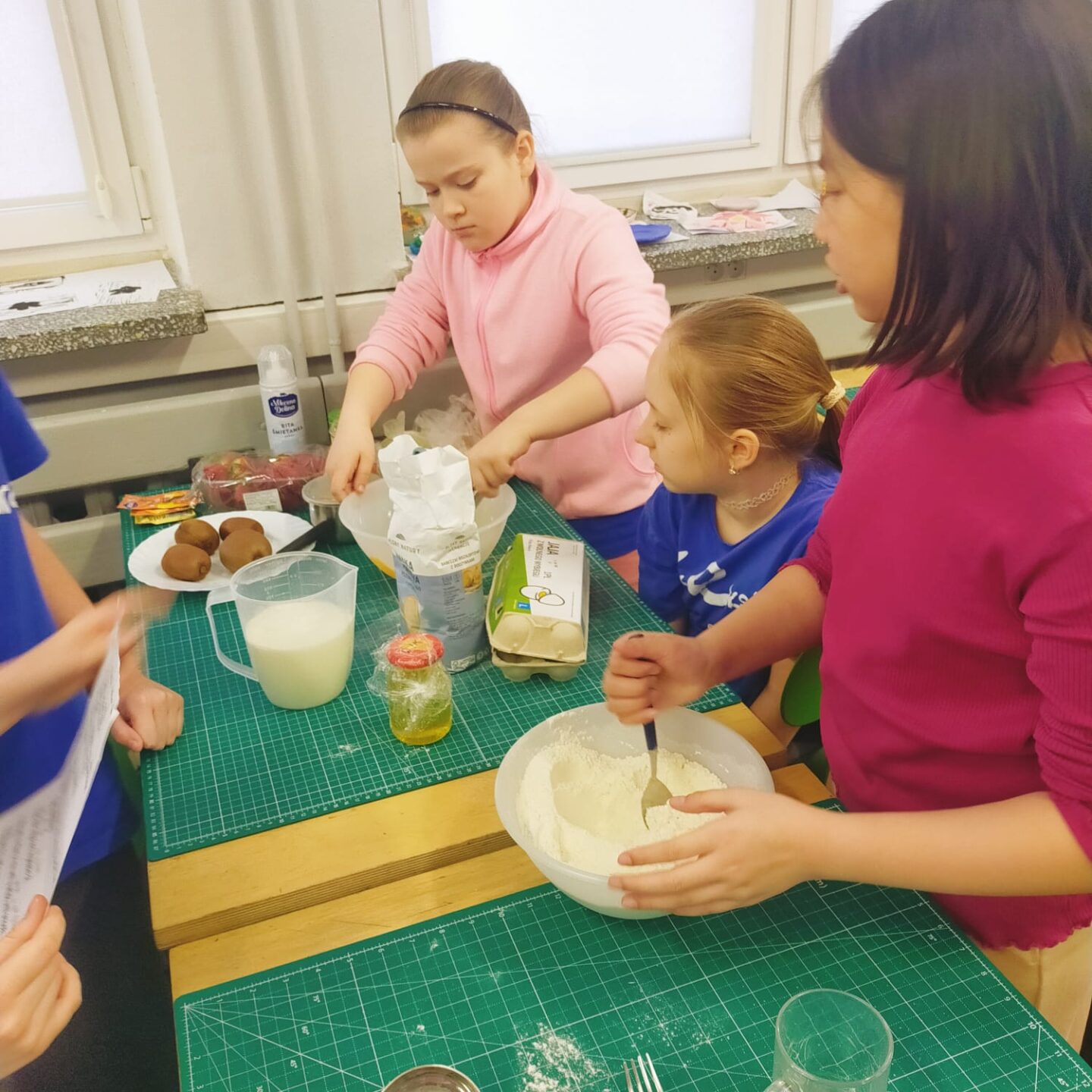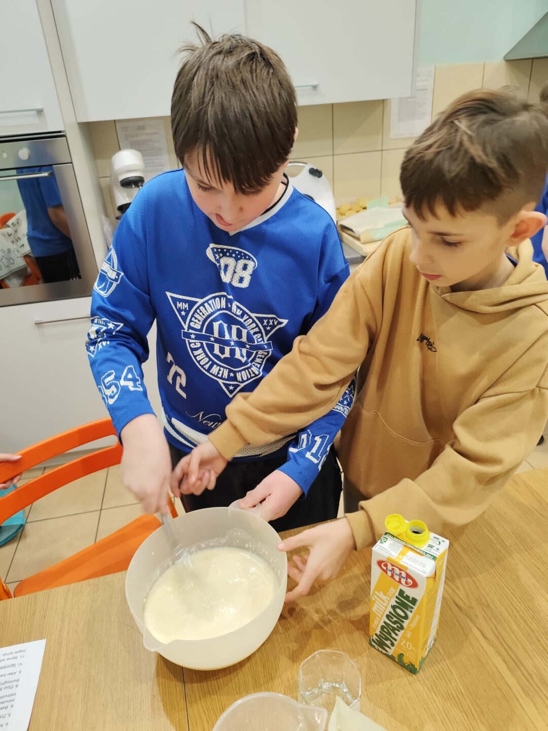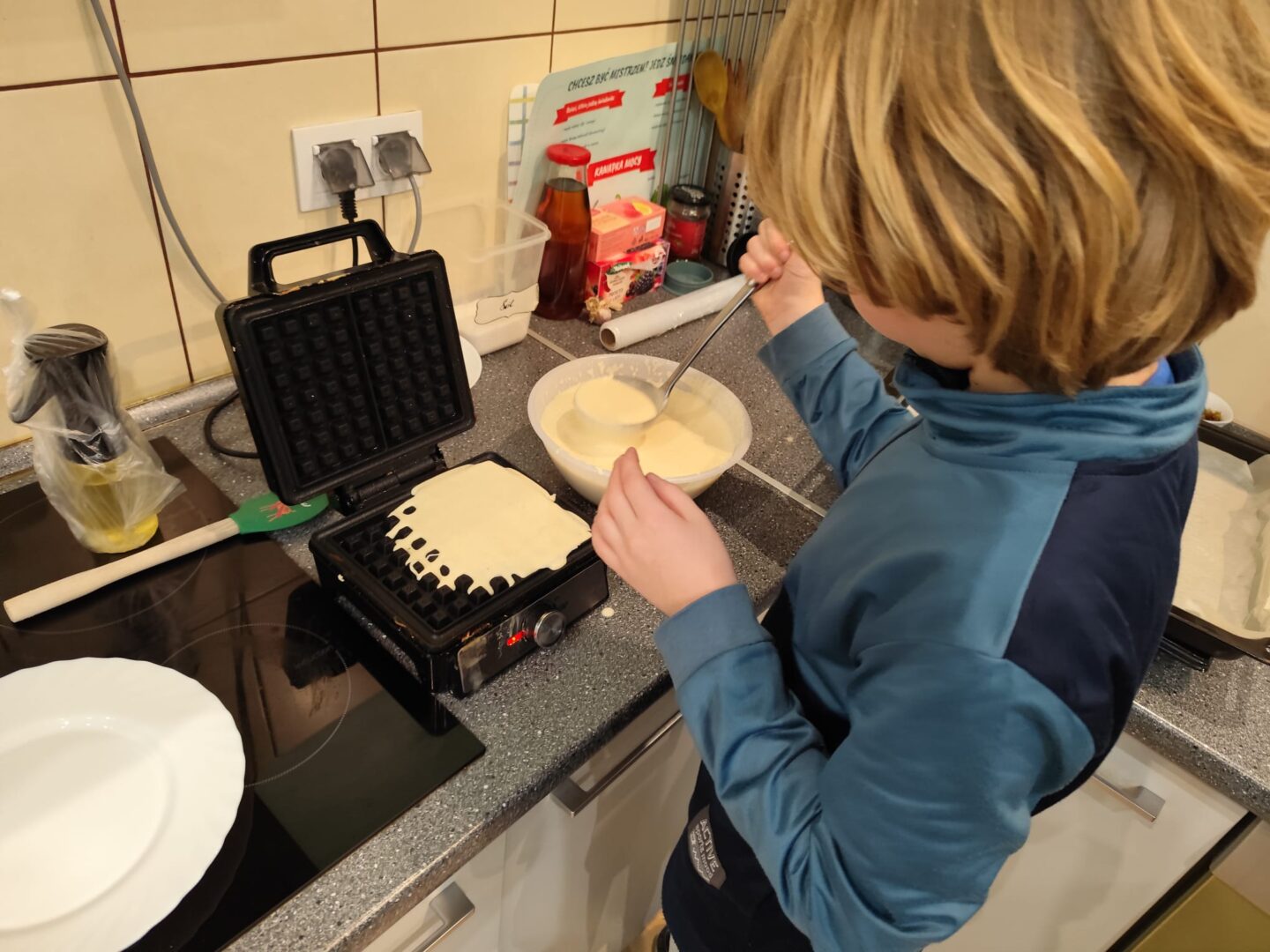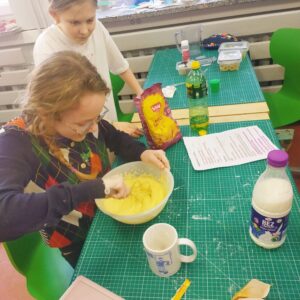 Uczniowie klasy czwartej w ramach programu nauczania j. angielskiego poznają m.in. nazwy produktów spożywczych. Wprowadzane jest również słownictwo związane ze sprzętami kuchennymi gotowaniem oraz przepisy kulinarne na proste dania. W ramach zajęć poznawaliśmy m.in. przepis na gofry, który to uczniowie klasy 4e postanowili wypróbować w praktyce. Podzieliliśmy się na grupy i korzystając z tego, iż w naszej szkole jest specjalna sala do gotowania wyposażona w sprzęt kuchenny, dzieci ochoczo przystąpiły do działania i przygotowały ”waffles” wg przepisu w j. angielskim. Nie zabrakło dodatków takich jak maple syrup, strawberries, bluberries, whipped cream and sprinkles. Sądząc po minach jedzących (fotorelacja poniżej) oraz tempie w jakim gofry znikały z talerzy, można uznać, co zresztą przyznali sami uczniowie, że była to: ”the most delicious English lesson”.
