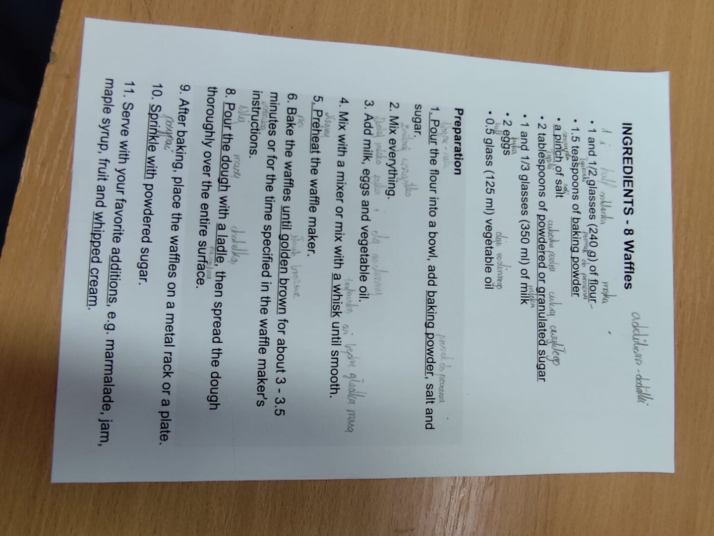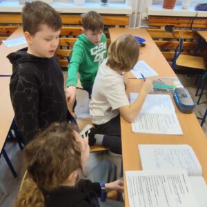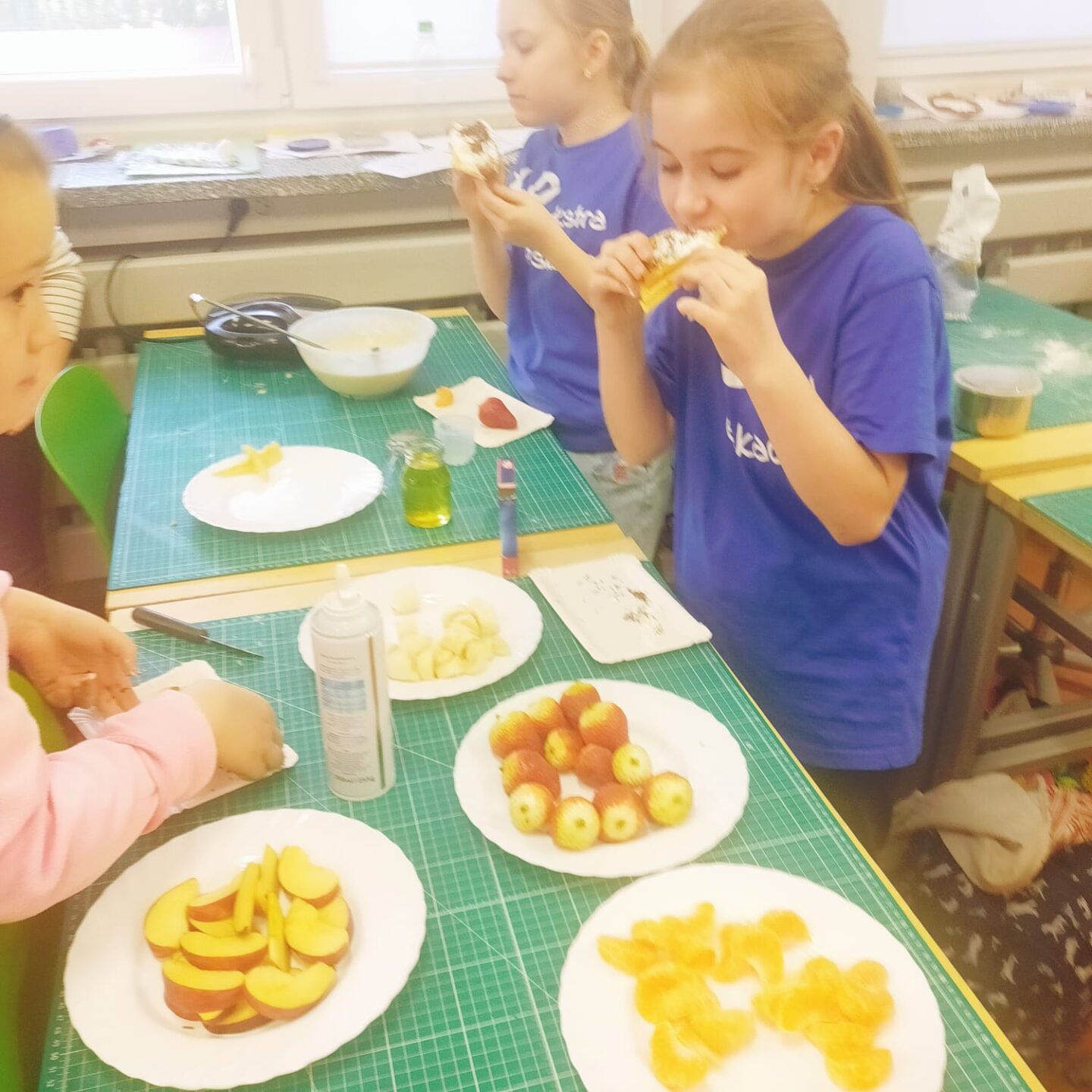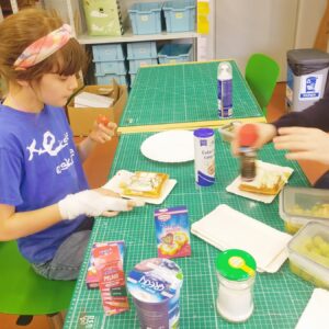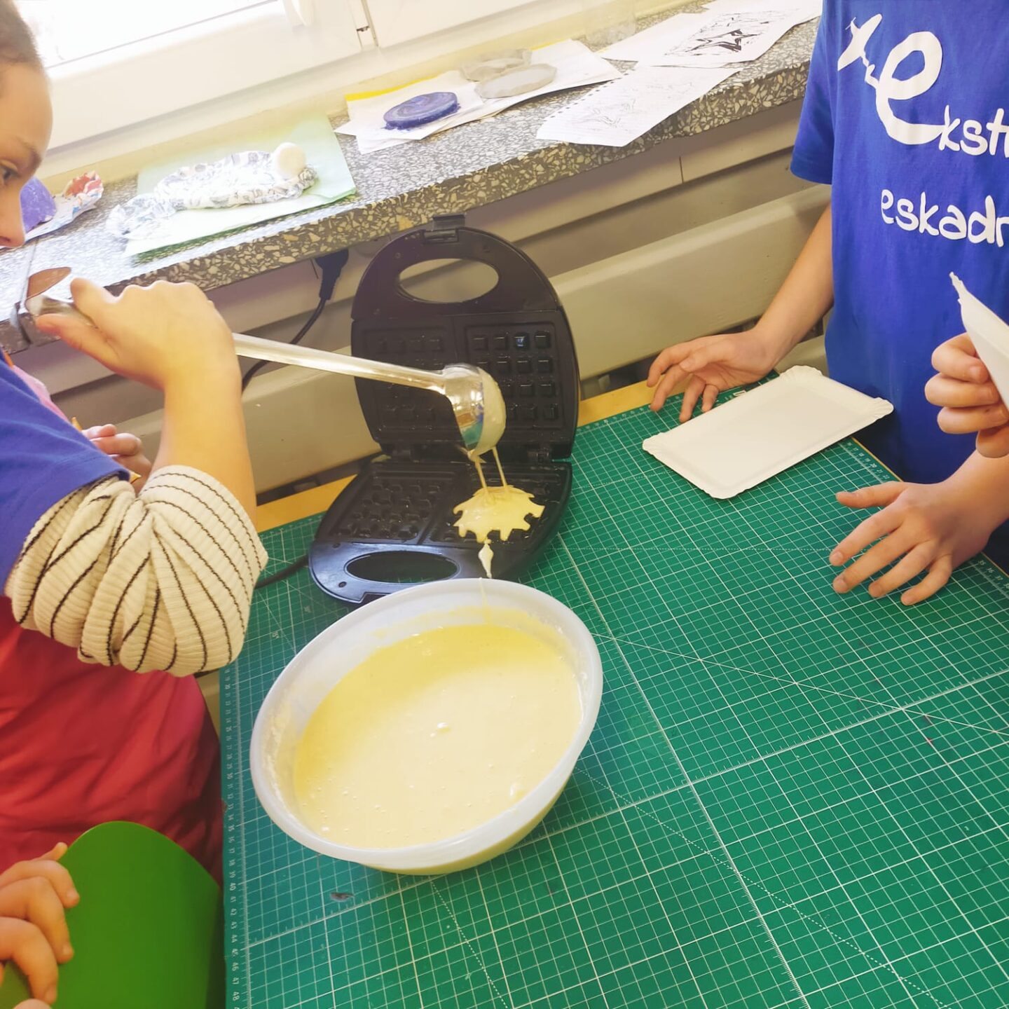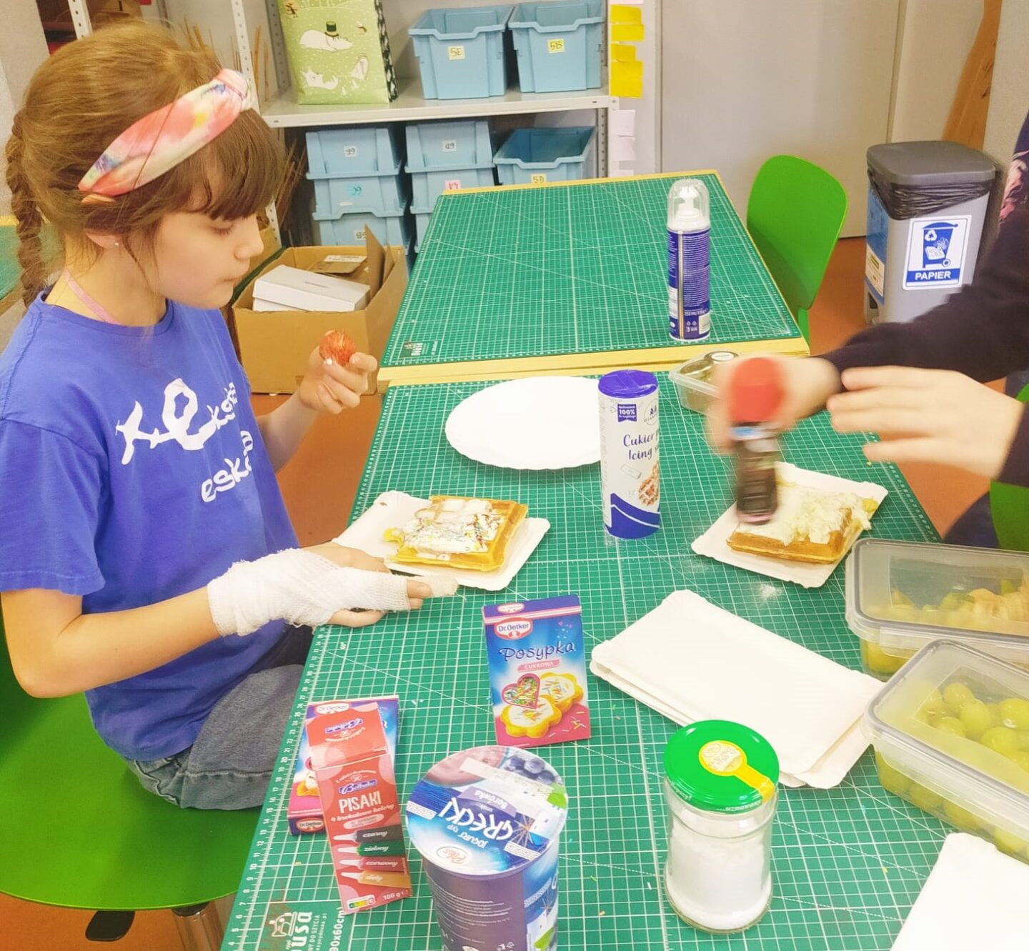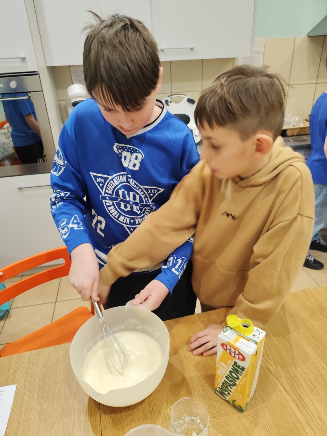 Uczniowie klasy czwartej w ramach programu nauczania j. angielskiego poznają m.in. nazwy produktów spożywczych. Wprowadzane jest również słownictwo związane ze sprzętami kuchennymi gotowaniem oraz przepisy kulinarne na proste dania. W ramach zajęć poznawaliśmy m.in. przepis na gofry, który to uczniowie klasy 4e postanowili wypróbować w praktyce. Podzieliliśmy się na grupy i korzystając z tego, iż w naszej szkole jest specjalna sala do gotowania wyposażona w sprzęt kuchenny, dzieci ochoczo przystąpiły do działania i przygotowały ”waffles” wg przepisu w j. angielskim. Nie zabrakło dodatków takich jak maple syrup, strawberries, bluberries, whipped cream and sprinkles. Sądząc po minach jedzących (fotorelacja poniżej) oraz tempie w jakim gofry znikały z talerzy, można uznać, co zresztą przyznali sami uczniowie, że była to: ”the most delicious English lesson”.