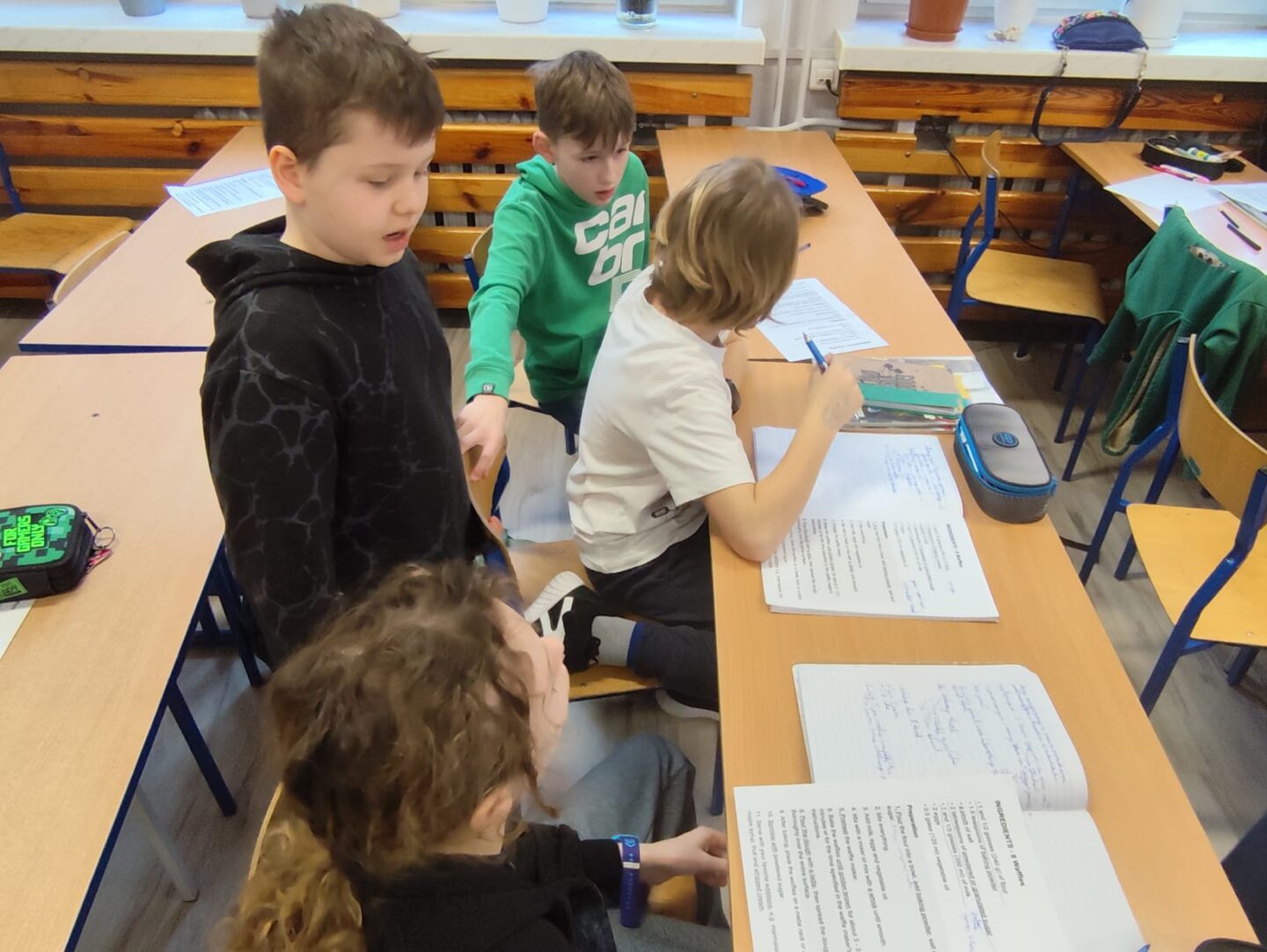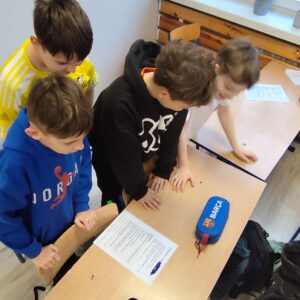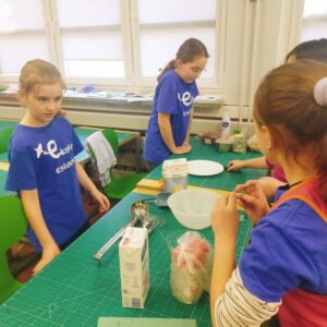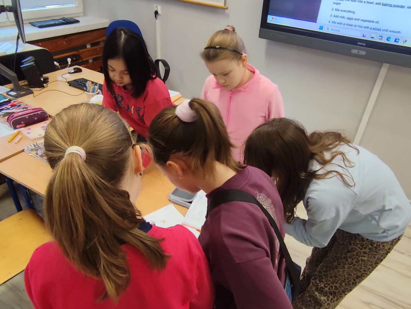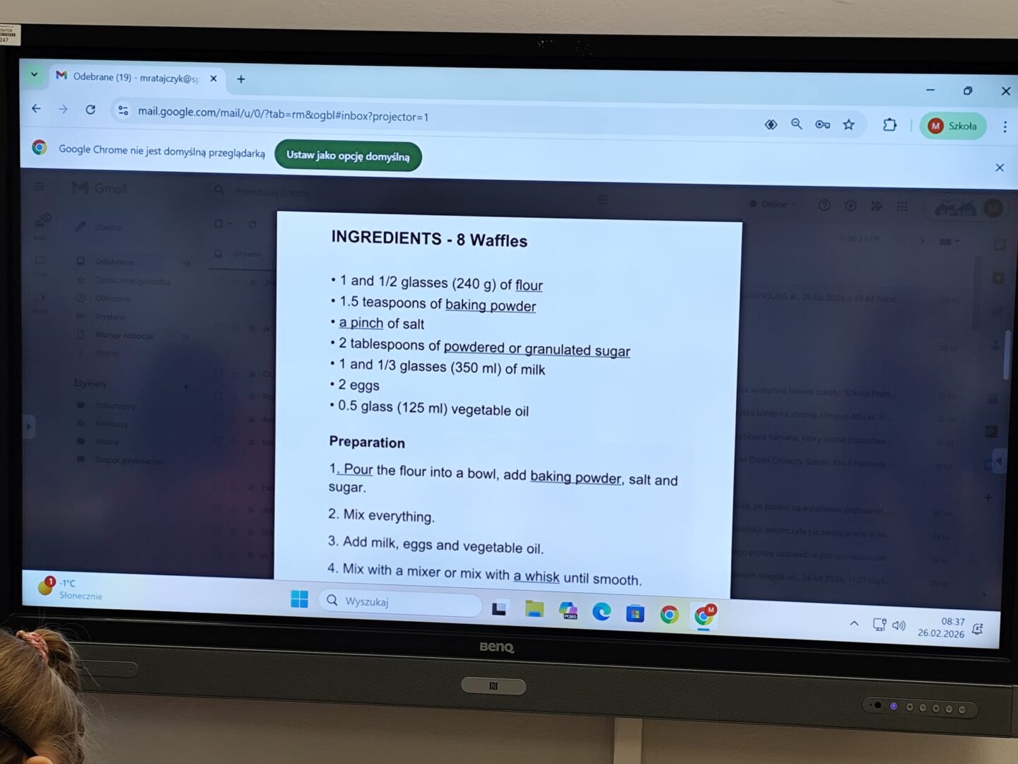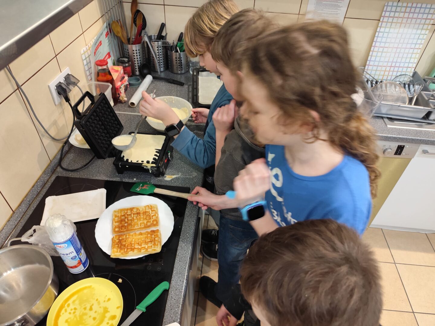 Uczniowie klasy czwartej w ramach programu nauczania j. angielskiego poznają m.in. nazwy produktów spożywczych. Wprowadzane jest również słownictwo związane ze sprzętami kuchennymi gotowaniem oraz przepisy kulinarne na proste dania. W ramach zajęć poznawaliśmy m.in. przepis na gofry, który to uczniowie klasy 4e postanowili wypróbować w praktyce. Podzieliliśmy się na grupy i korzystając z tego, iż w naszej szkole jest specjalna sala do gotowania wyposażona w sprzęt kuchenny, dzieci ochoczo przystąpiły do działania i przygotowały ”waffles” wg przepisu w j. angielskim. Nie zabrakło dodatków takich jak maple syrup, strawberries, bluberries, whipped cream and sprinkles. Sądząc po minach jedzących (fotorelacja poniżej) oraz tempie w jakim gofry znikały z talerzy, można uznać, co zresztą przyznali sami uczniowie, że była to: ”the most delicious English lesson”.