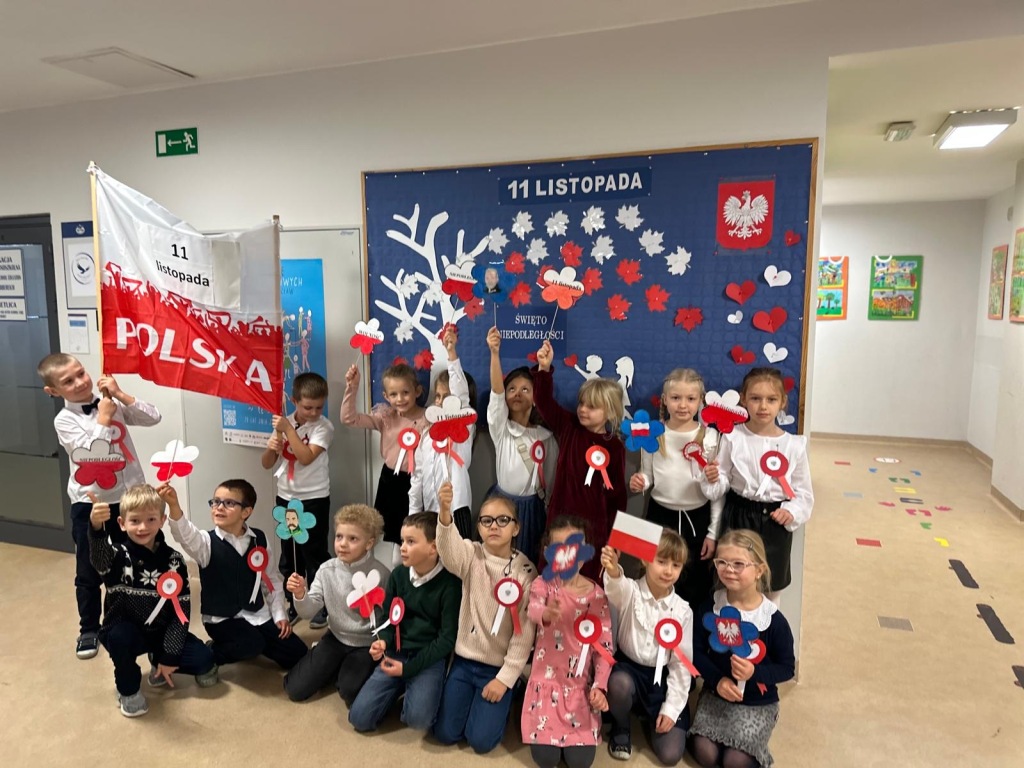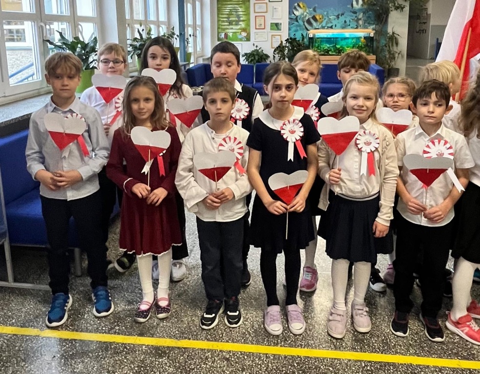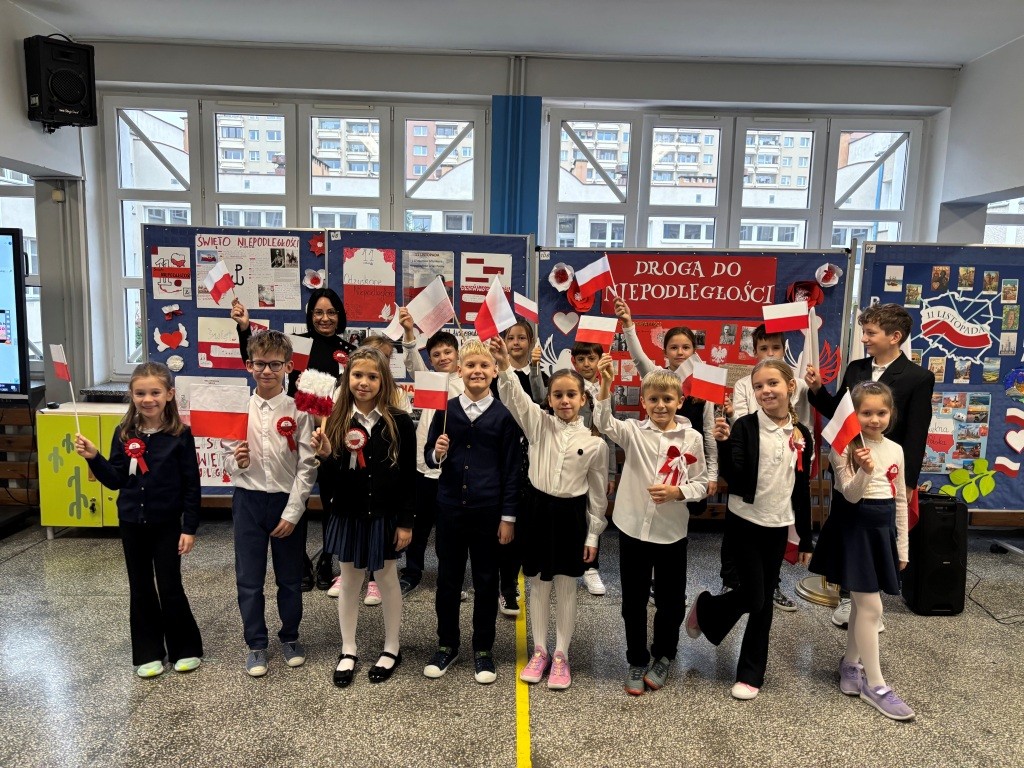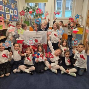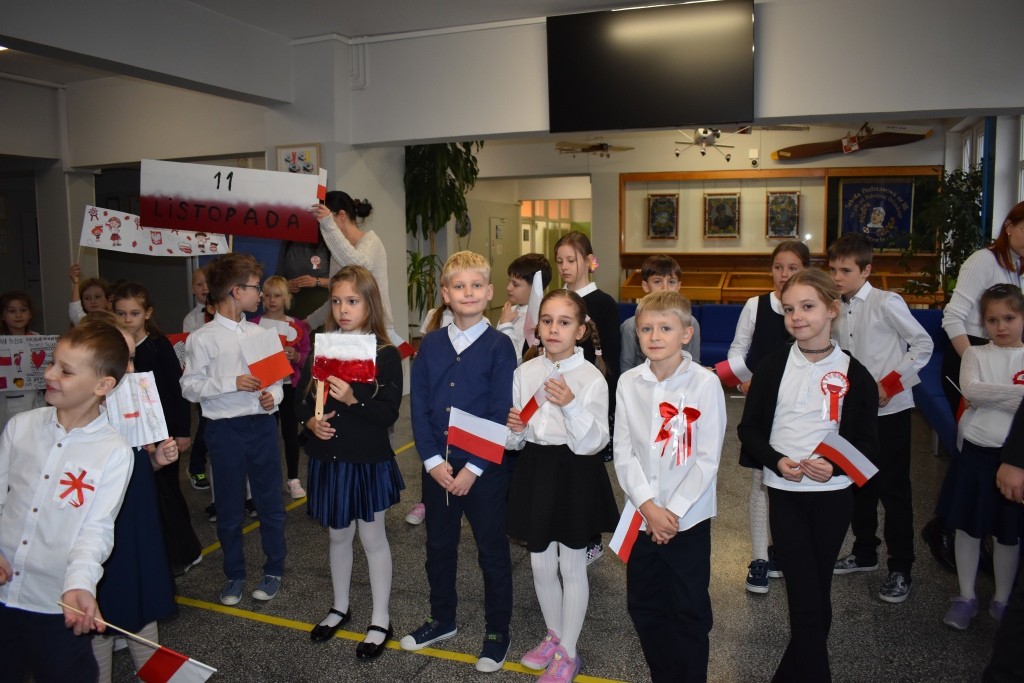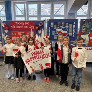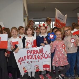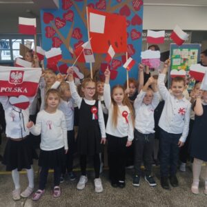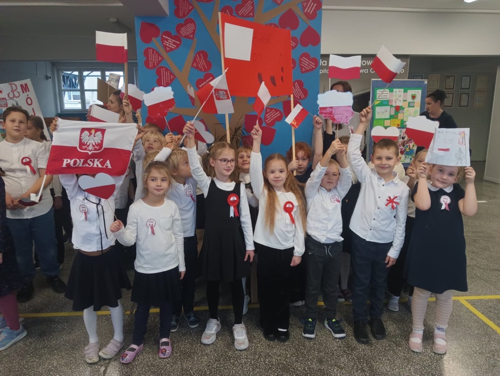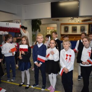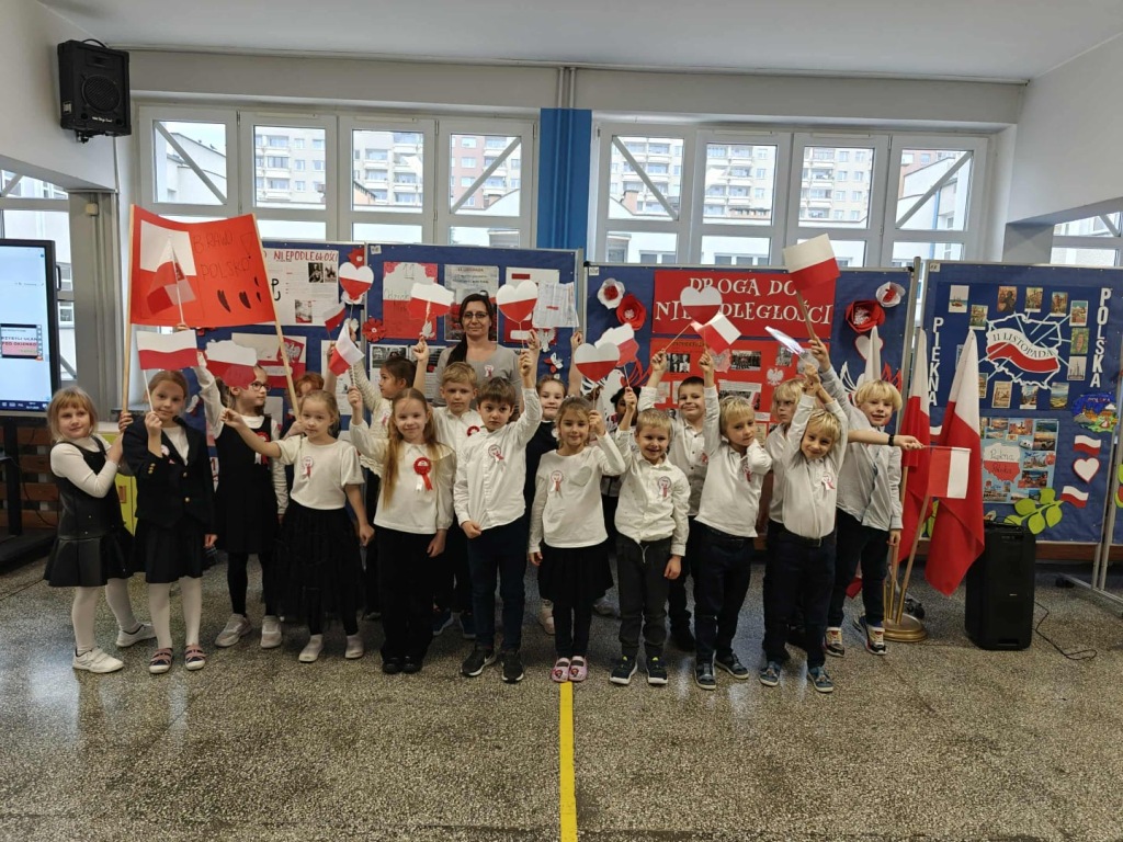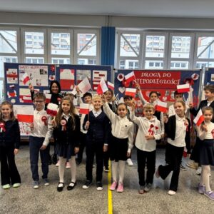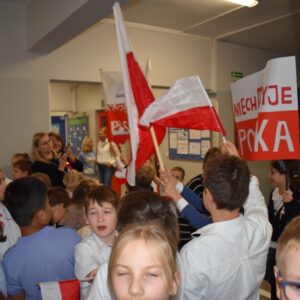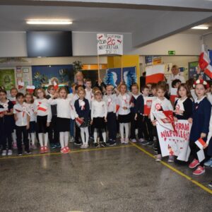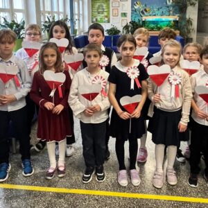 10 listopada w naszej szkole odbyło się wyjątkowe spotkanie patriotyczne, w którym uczestniczyli uczniowie klas 1-3 wraz z wychowawcami. W szkolnym holu rozbrzmiały dźwięki Mazurka Dąbrowskiego, który wszyscy odśpiewali z dumą i powagą. Następnie każda klasa zaprezentowała przygotowane wcześniej pieśni patriotyczne, m.in. „Przybyli ułani pod okienko”, „Szara piechota” oraz „Flaga biało-czerwona”.