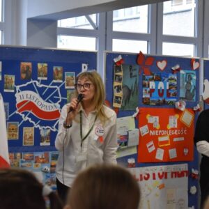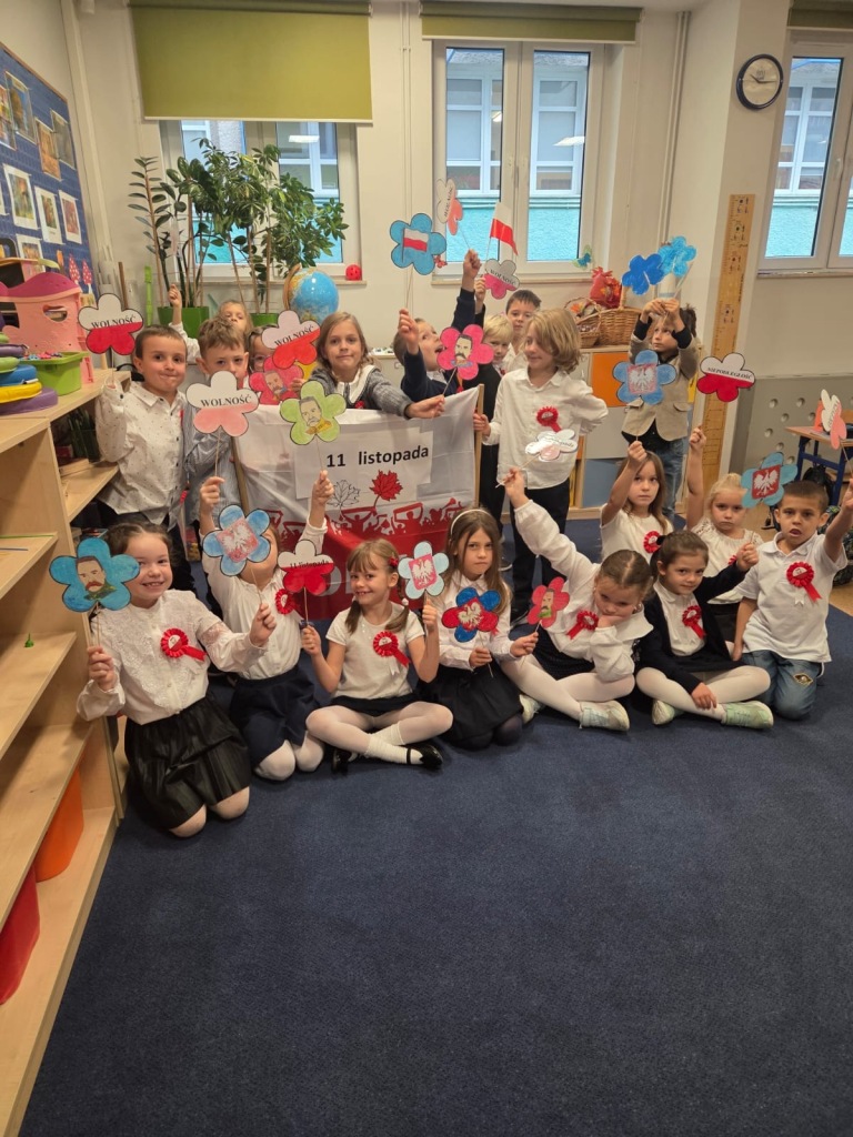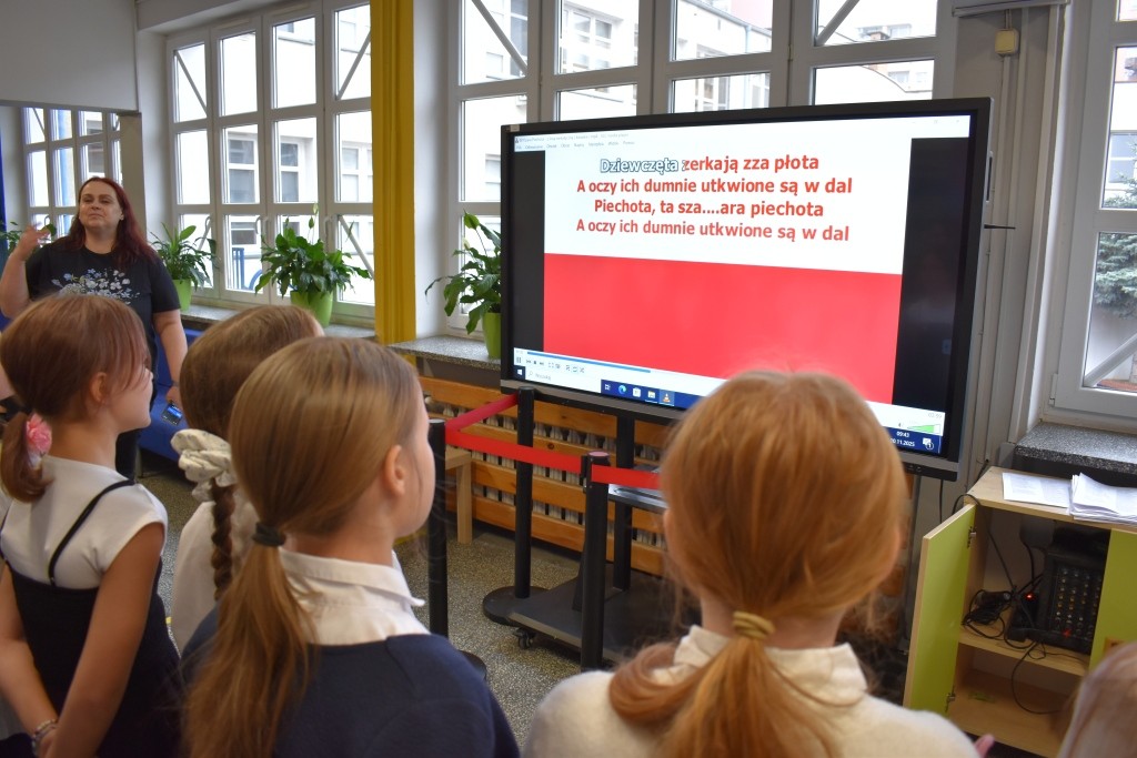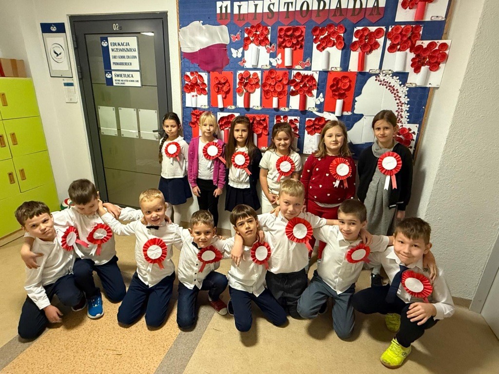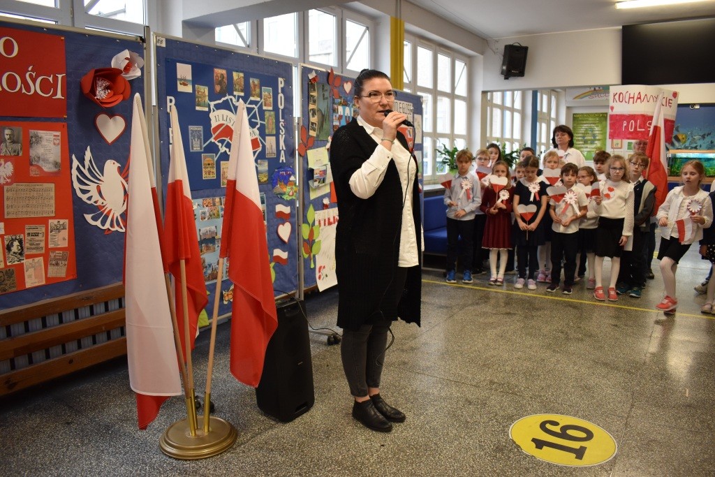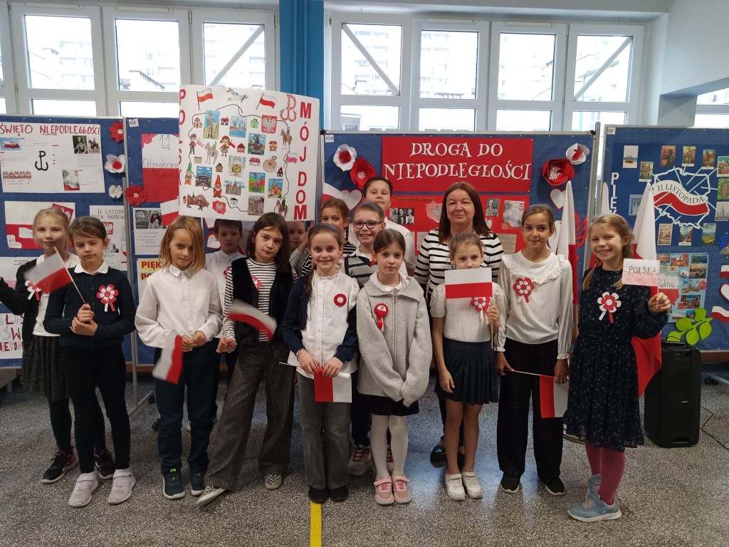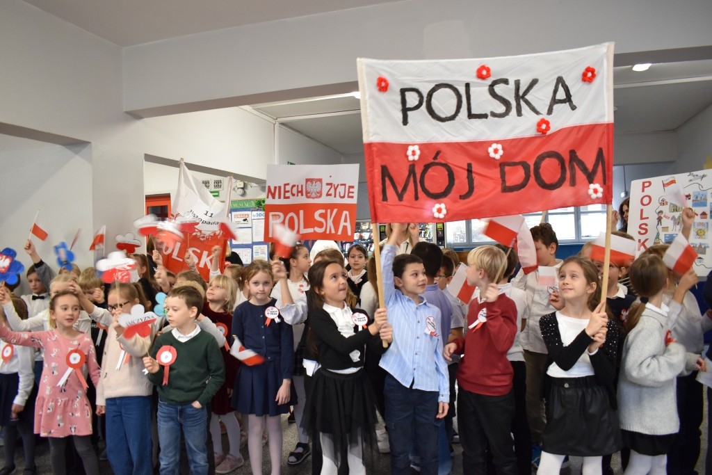10 listopada w naszej szkole odbyło się wyjątkowe spotkanie patriotyczne, w którym uczestniczyli uczniowie klas 1-3 wraz z wychowawcami. W szkolnym holu rozbrzmiały dźwięki Mazurka Dąbrowskiego, który wszyscy odśpiewali z dumą i powagą. Następnie każda klasa zaprezentowała przygotowane wcześniej pieśni patriotyczne, m.in. „Przybyli ułani pod okienko”, „Szara piechota” oraz „Flaga biało-czerwona”.