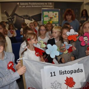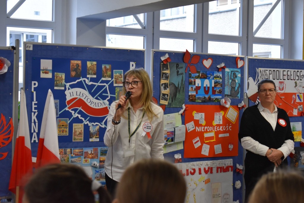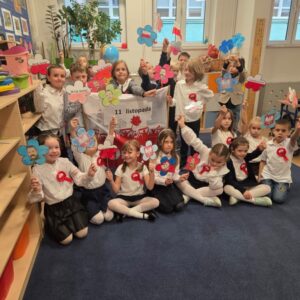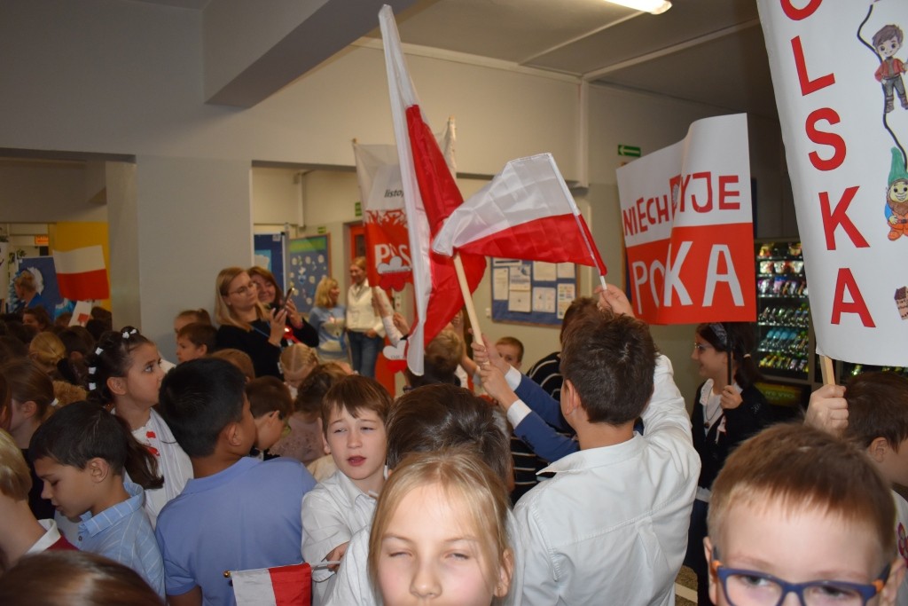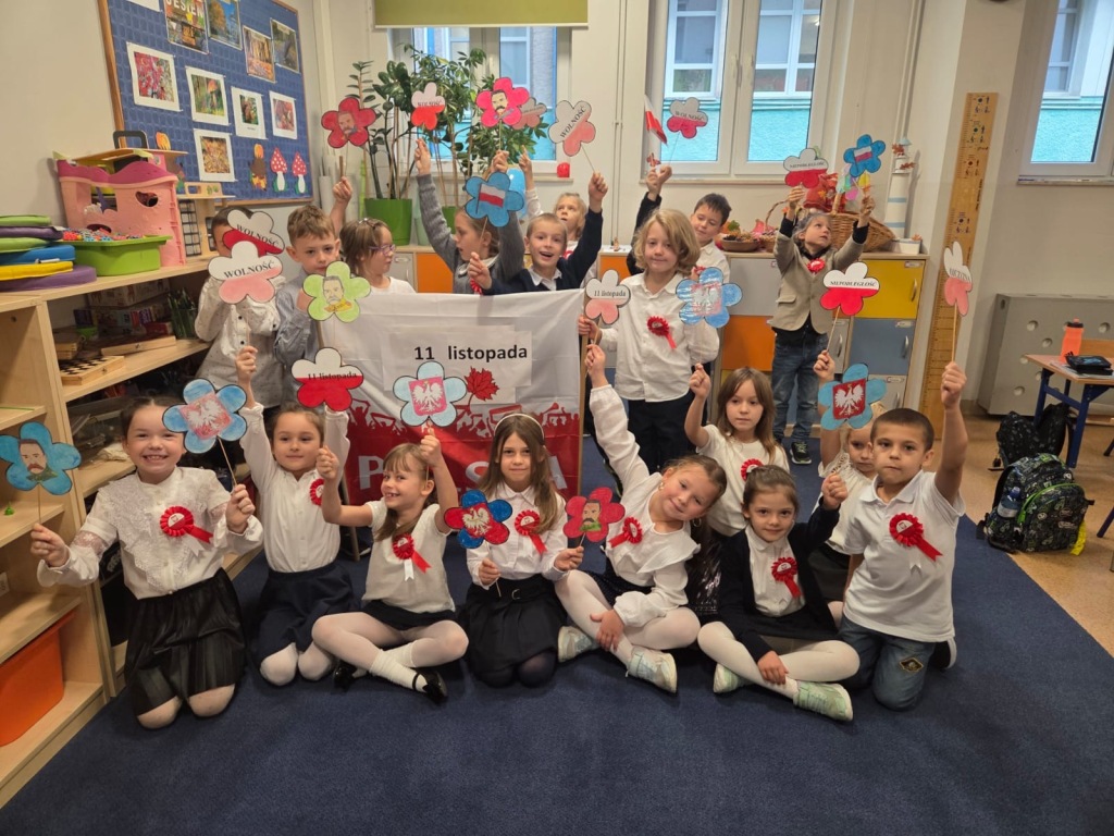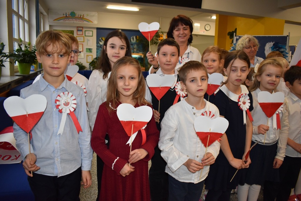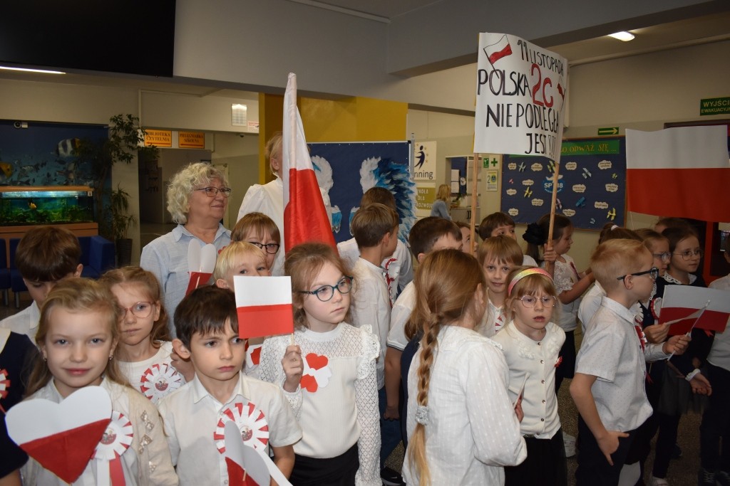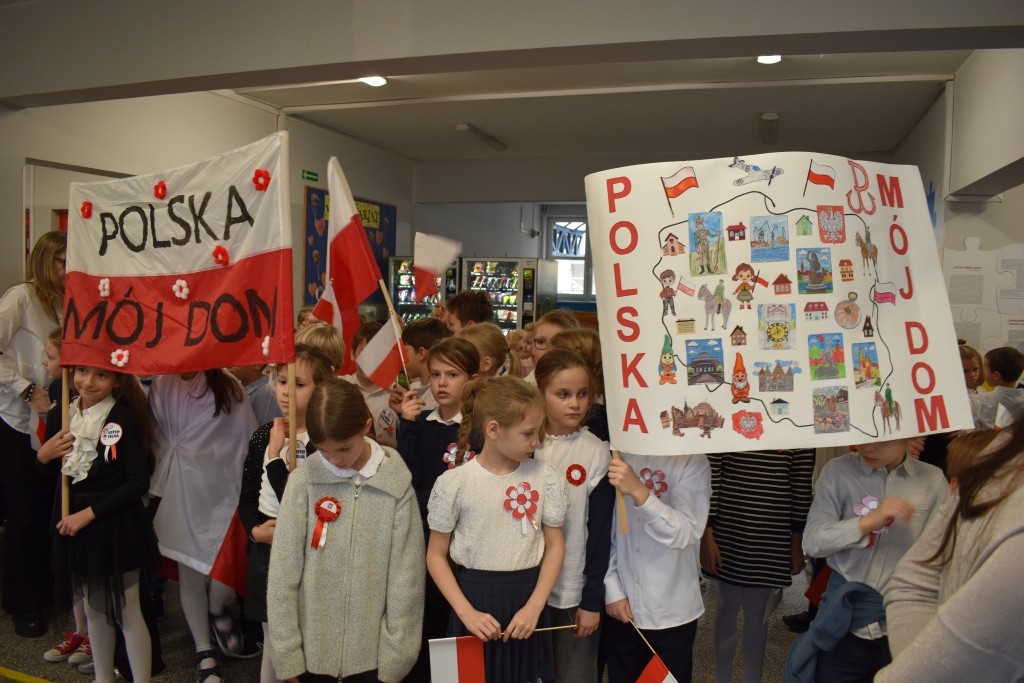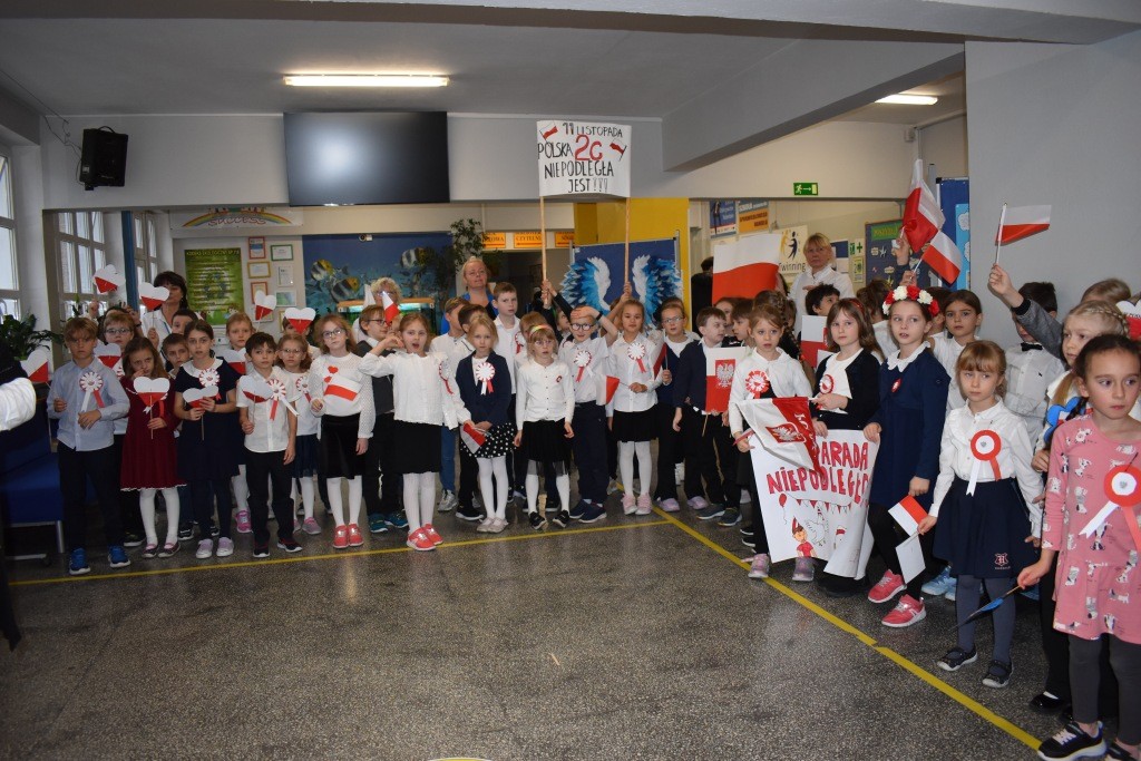 10 listopada w naszej szkole odbyło się wyjątkowe spotkanie patriotyczne, w którym uczestniczyli uczniowie klas 1-3 wraz z wychowawcami. W szkolnym holu rozbrzmiały dźwięki Mazurka Dąbrowskiego, który wszyscy odśpiewali z dumą i powagą. Następnie każda klasa zaprezentowała przygotowane wcześniej pieśni patriotyczne, m.in. „Przybyli ułani pod okienko”, „Szara piechota” oraz „Flaga biało-czerwona”.