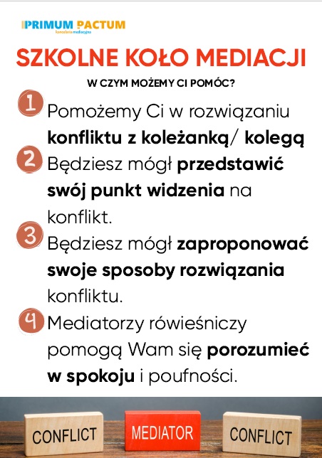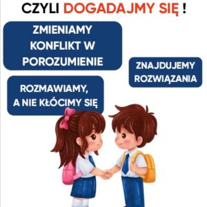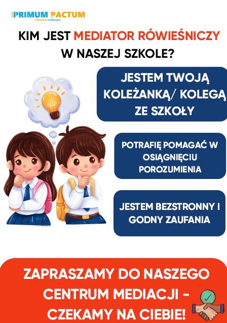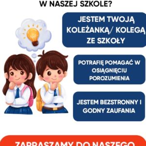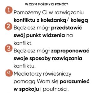 To rozmowa prowadzona przy wsparciu specjalnie przygotowanego ucznia – mediatora. Jego rolą nie jest ocenianie ani wskazywanie winnych, lecz pomaganie w spokojnym dialogu, wysłuchaniu obu stron i dojściu do porozumienia