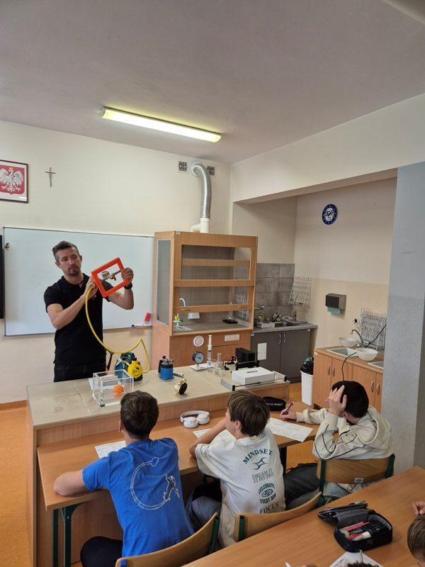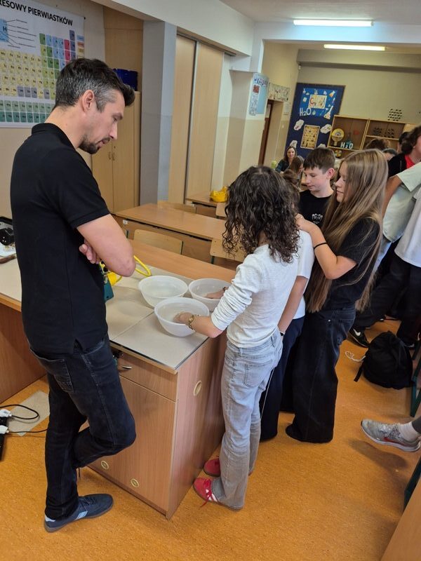 Na ostatnich warsztatach prowadzonych przez dr inż. Cezarego Czajkowskiego, które były prawdziwą lekcją fizyki w praktyce, uczniowie 8a i 8c mogli zaobserwować, jak różne materiały zmieniają swoje właściwości pod wpływem temperatury. Nie zabrakło też doświadczeń z wodą – najbardziej niezwykłą substancją, jaką znamy. Uczniowie poznali jej tajemnice: