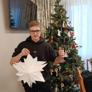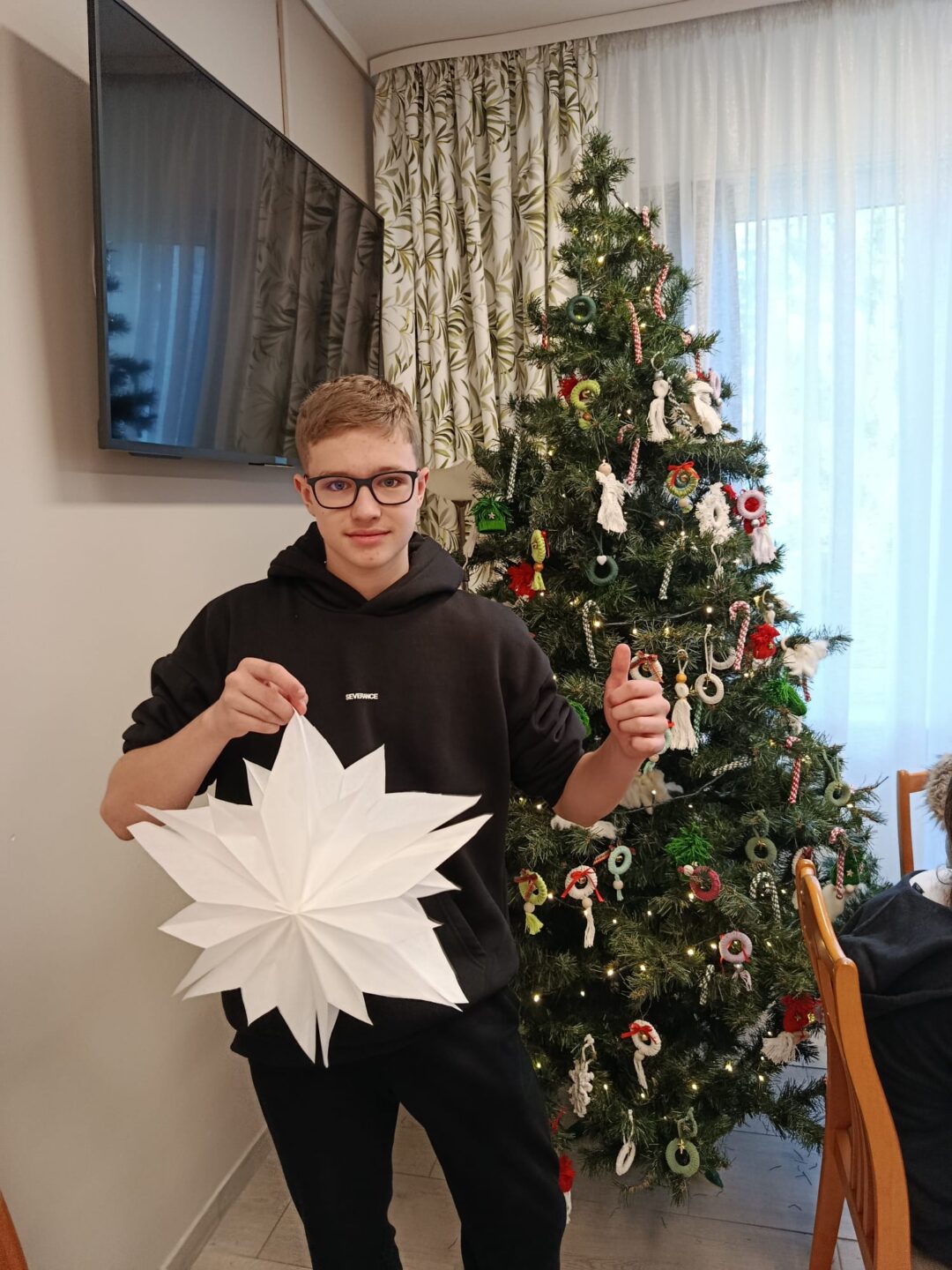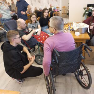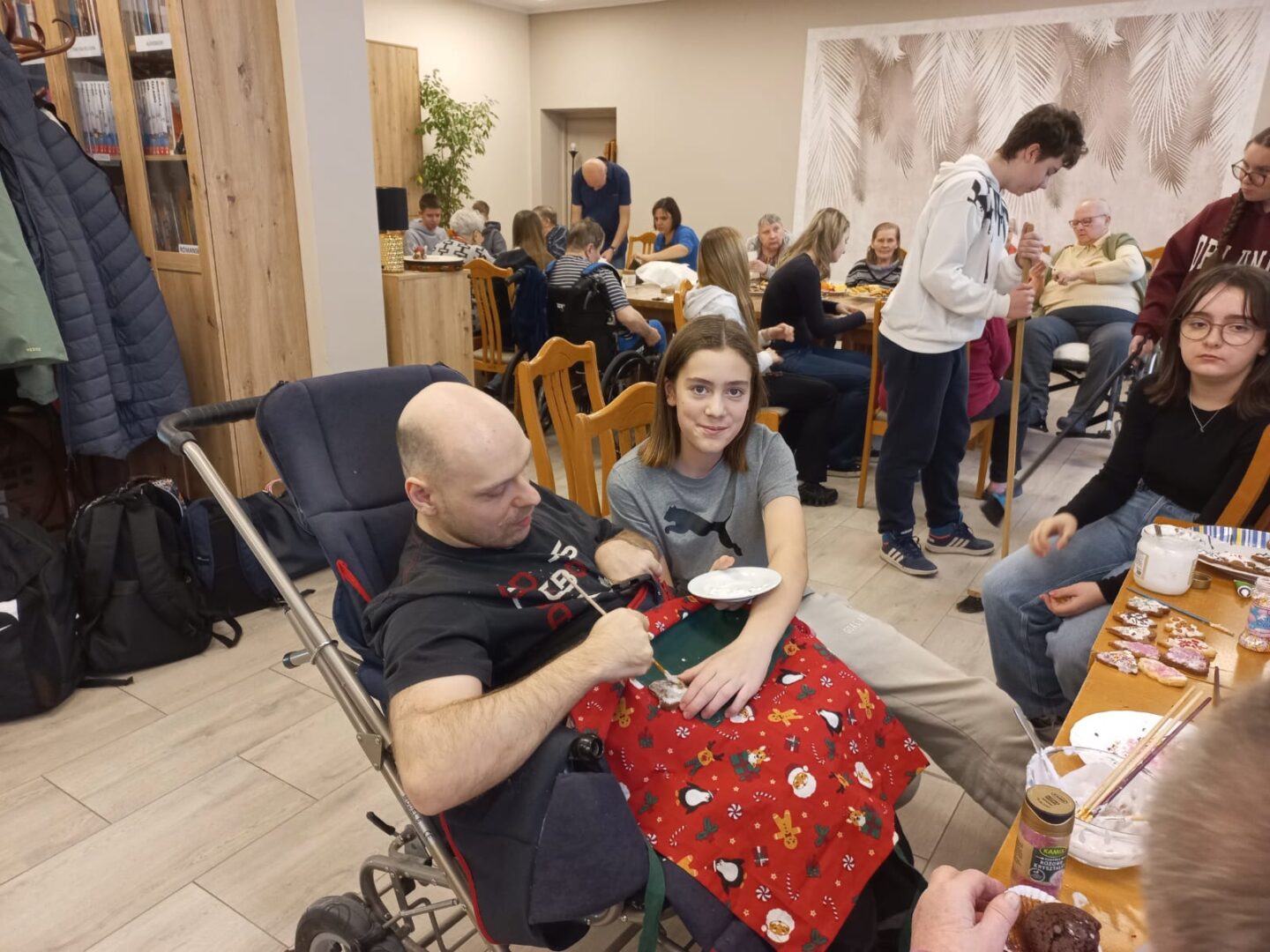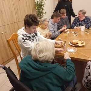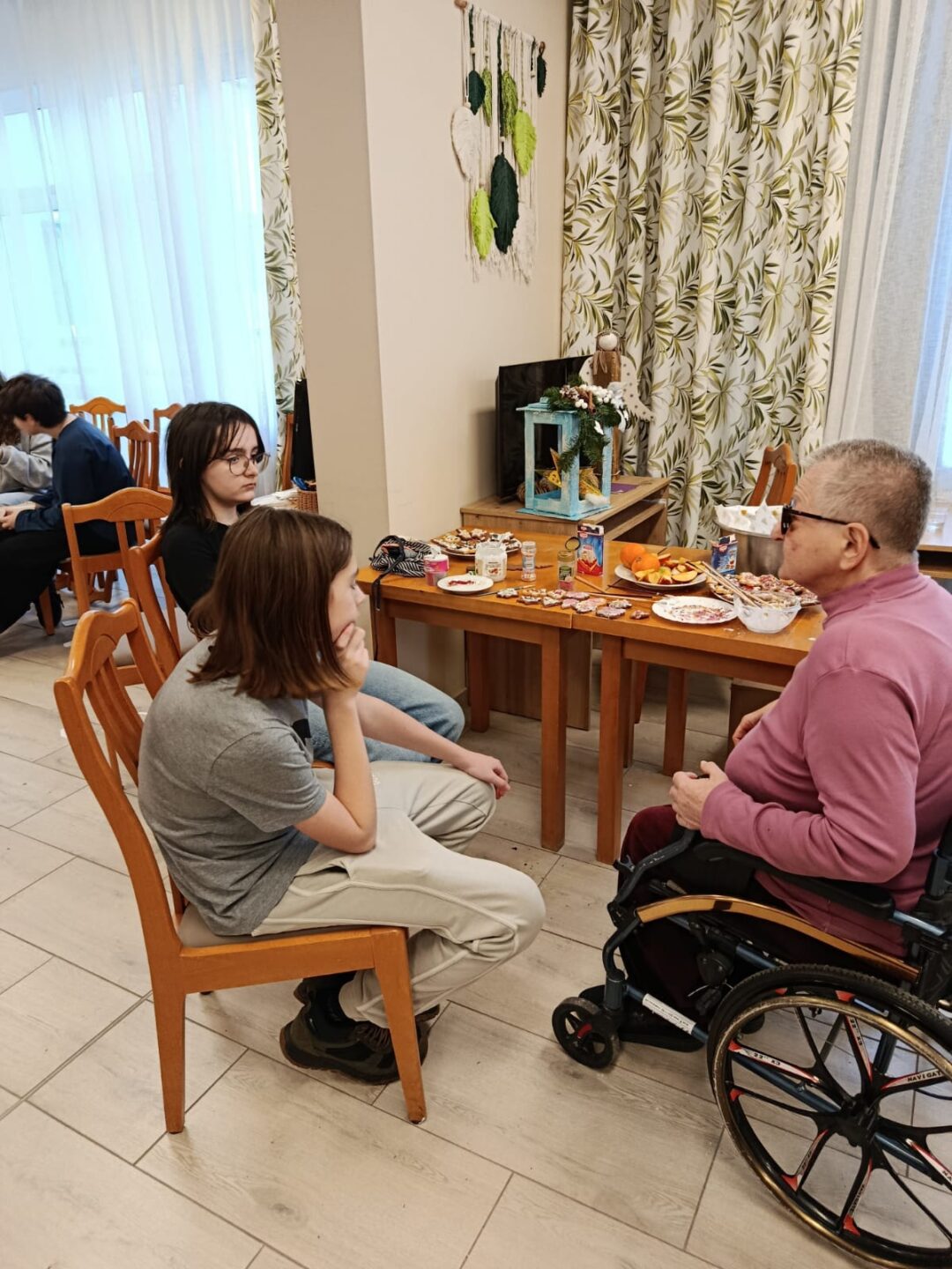 Z bogatymi paczkami i jeszcze bogatszymi sercami uczniowie zawitali do Domu Pomocy Społecznej, gdzie od pierwszych chwil panowała niezwykle ciepła i serdeczna atmosfera. Na miejscu wspólnie z mieszkańcami ubierali choinki, dekorowali pierniczki oraz wykonywali papierowe gwiazdy. Był to czas rozmów, uśmiechów i wzruszeń. Spotkanie międzypokoleniowe okazało się niezwykle wartościowym doświadczeniem dla wszystkich uczestników. Uczniowie odkryli w sobie najlepszą wersję siebie – doświadczyli, jak wielką wartością jest dawanie swojego czasu, uwagi i obecności. Nawiązali prawdziwe relacje z mieszkańcami DPS-u, wykazując się empatią, cierpliwością oraz wrażliwością na potrzeby osób starszych.